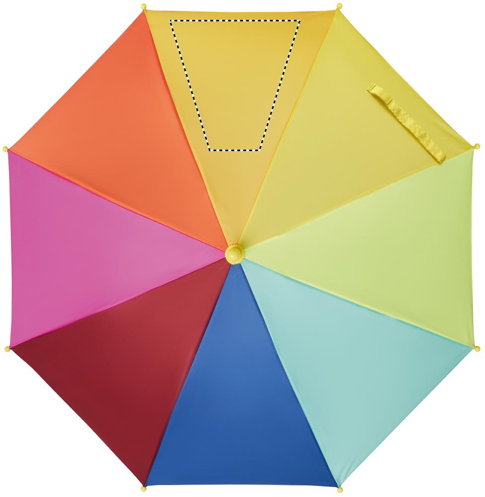 18'''' Regenschirm für Kinder aus 190T Pongee mit Regenbogenmuster. 8 Segmente. Stock und Stangen aus Fiberglas. Spitzen und Griff aus Kunststoff. Gebogener Griff. Manuelle Öffnung und Schließung.