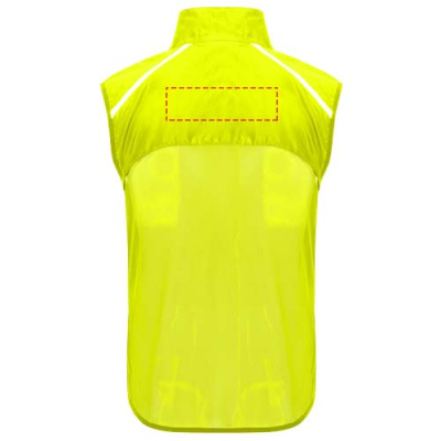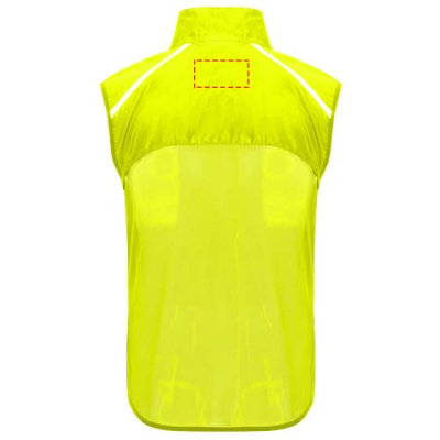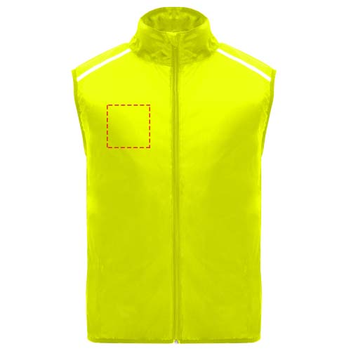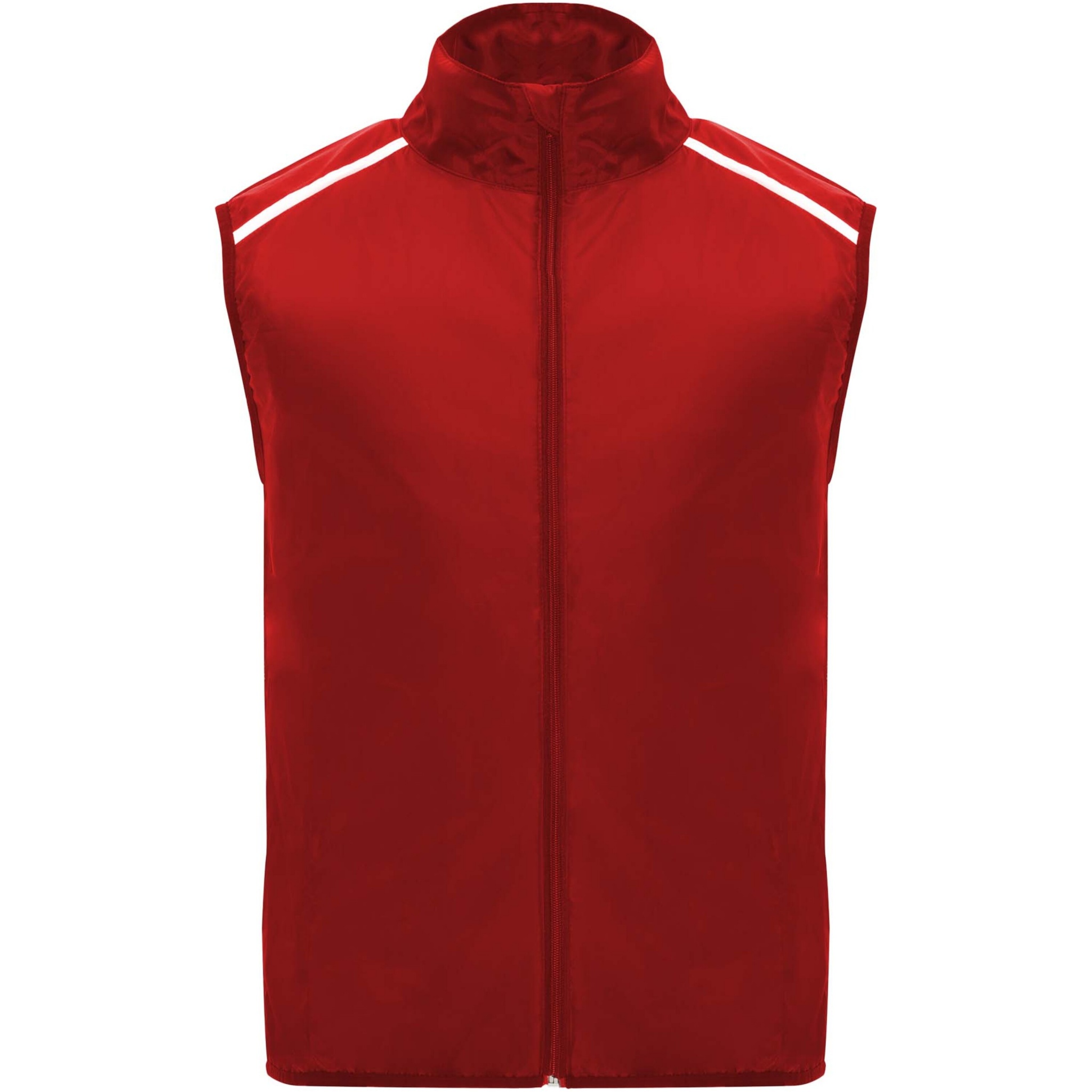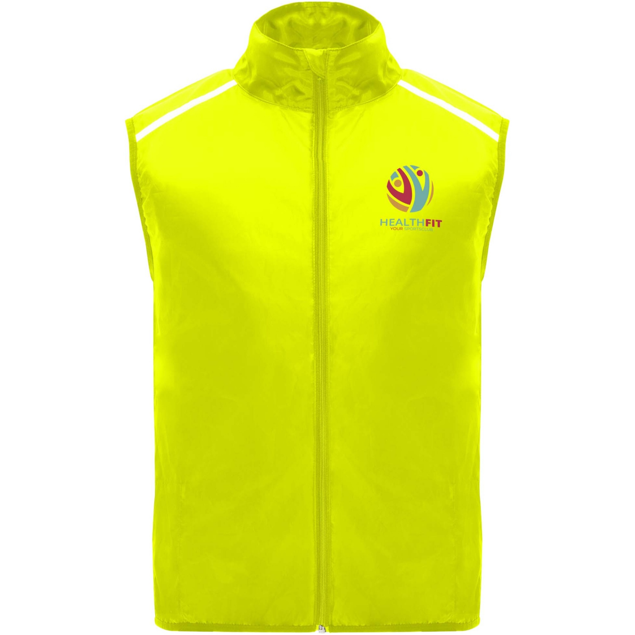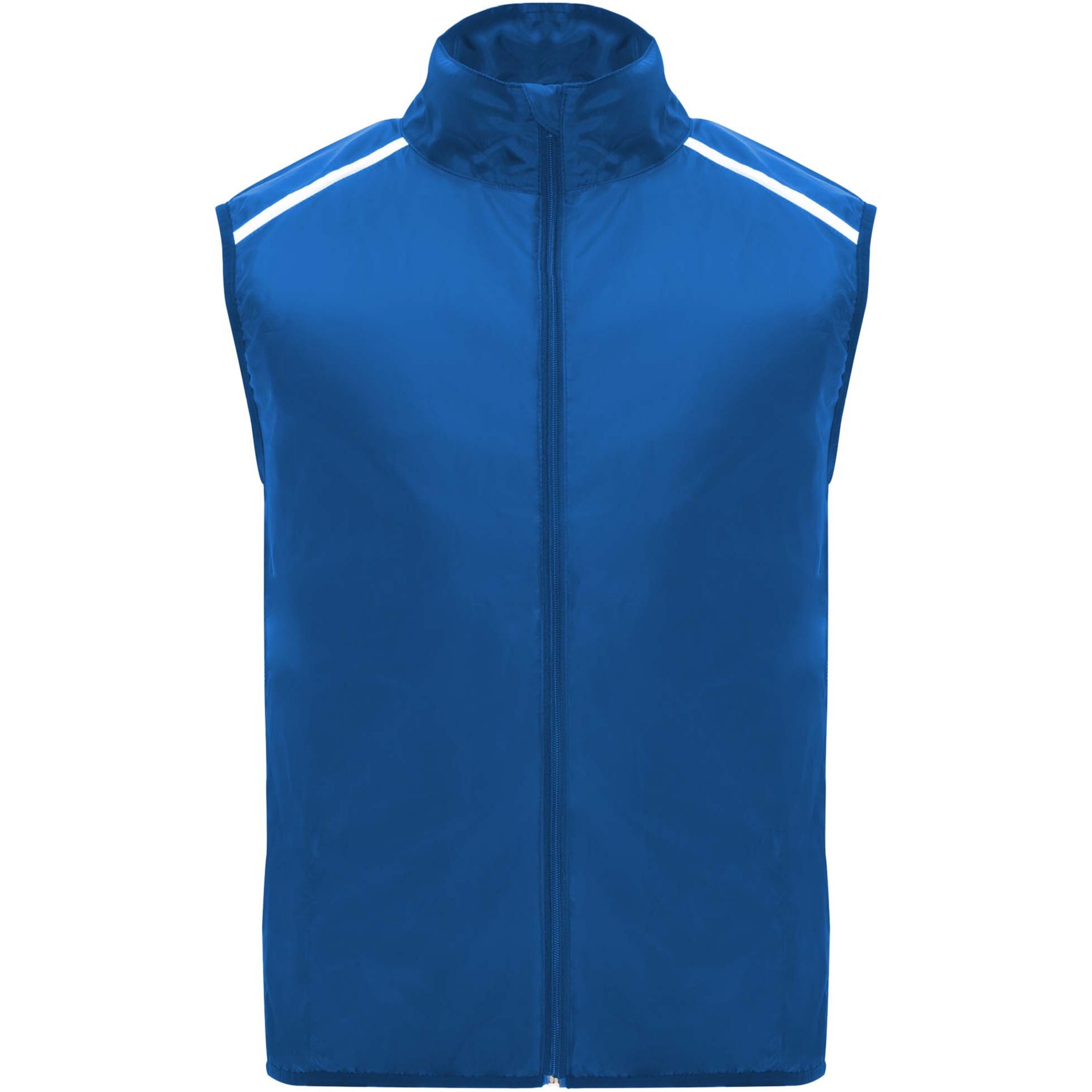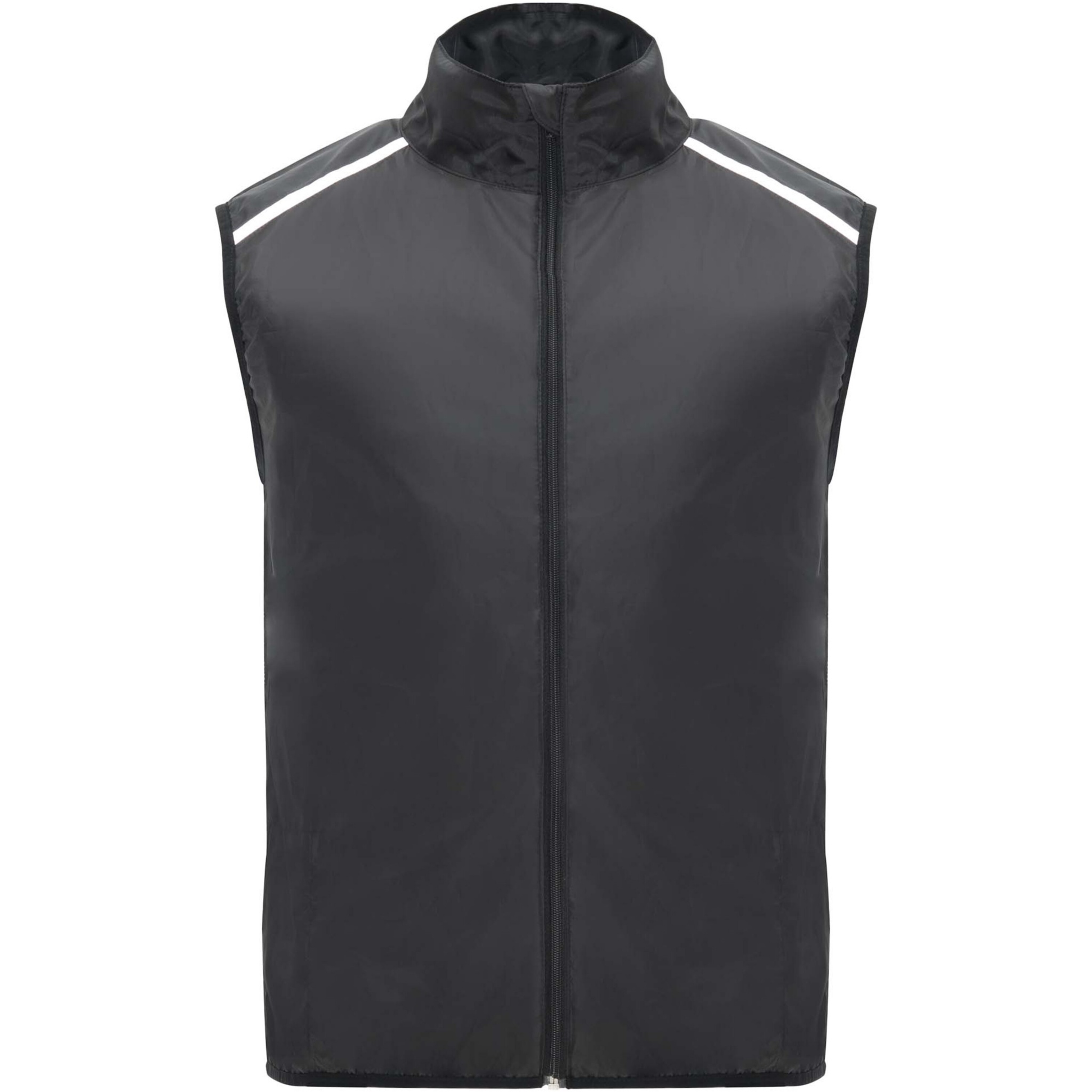 Leichte Funktions - Laufweste, winddicht und atmungsaktiv. Frontreißverschluss mit passendem Kinnschutz. Elastische Einfassung am Armausschnitt und Saum. Untere Rückenpartie aus mikroperforiertem Stoff. Reflektierende Details auf den Schultern, Front- und Rückseite. Tasche mit elastischem Band zum Verstauen der Weste und zum Tragen am Handgelenk. Abnehmbares Etikett.