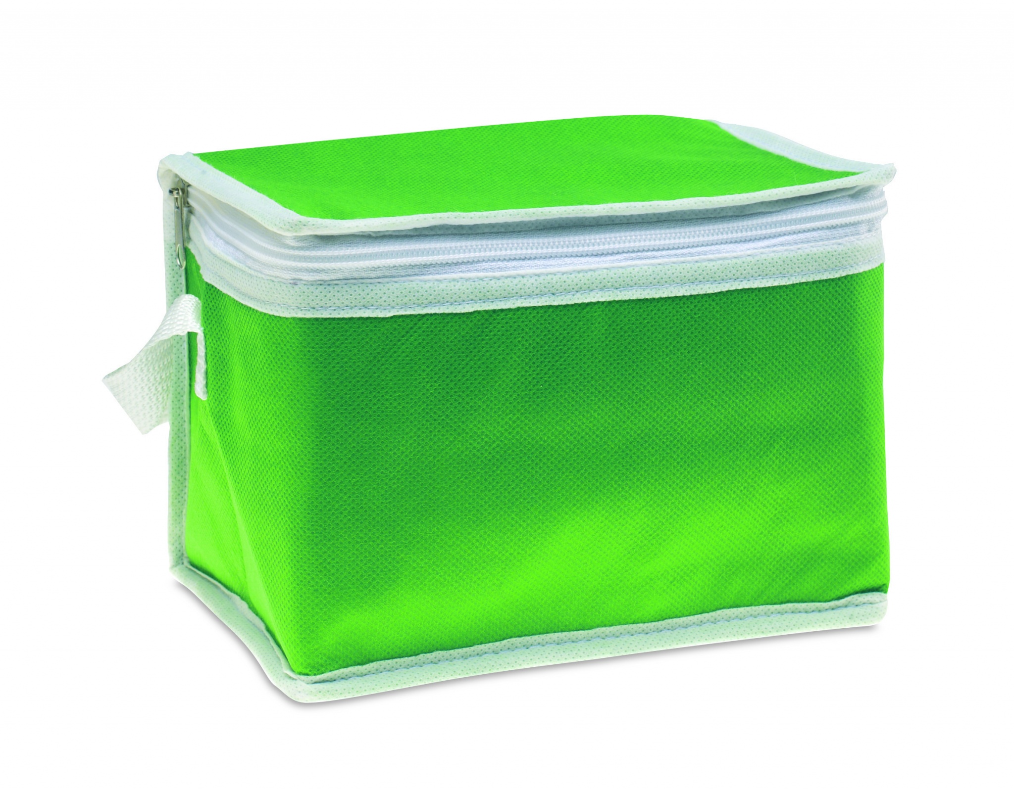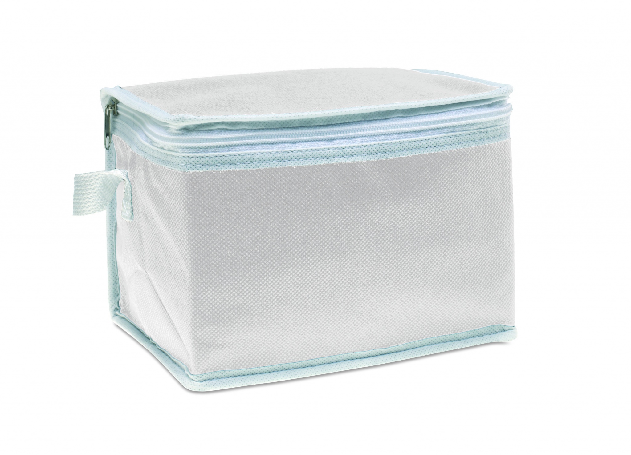 Kühltasche mit isolierender Aluminium-Folie für 6 Dosen. Außenseiten Non Woven mit weißen Absetzungen. 80 g/m². Isoliermaterial: Mit Aluminiumfolie laminierter Schaumstoff. Füllmenge 3L.