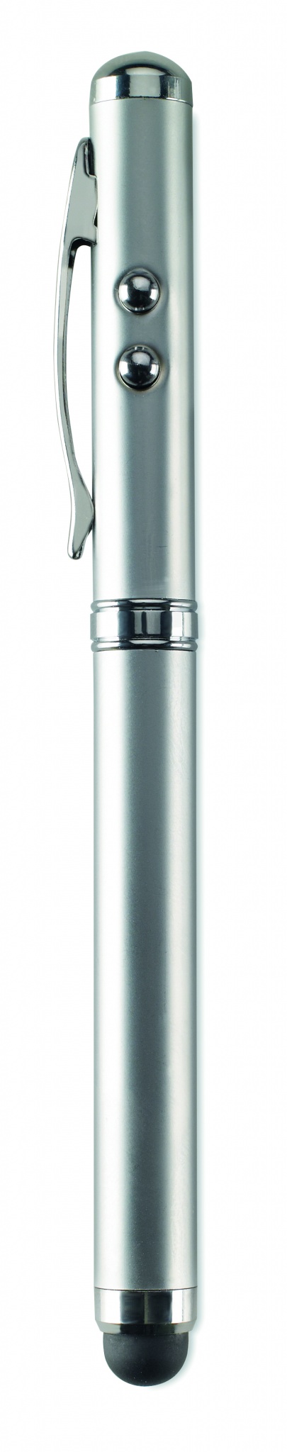 Multifunktioneller Laserpointer aus Metall. Mit Kugelschreiber, LED-Licht und Stylus. Lieferung in einer Metallbox. Inklusive 3 Knopfzellen. Schwarze Tinte.