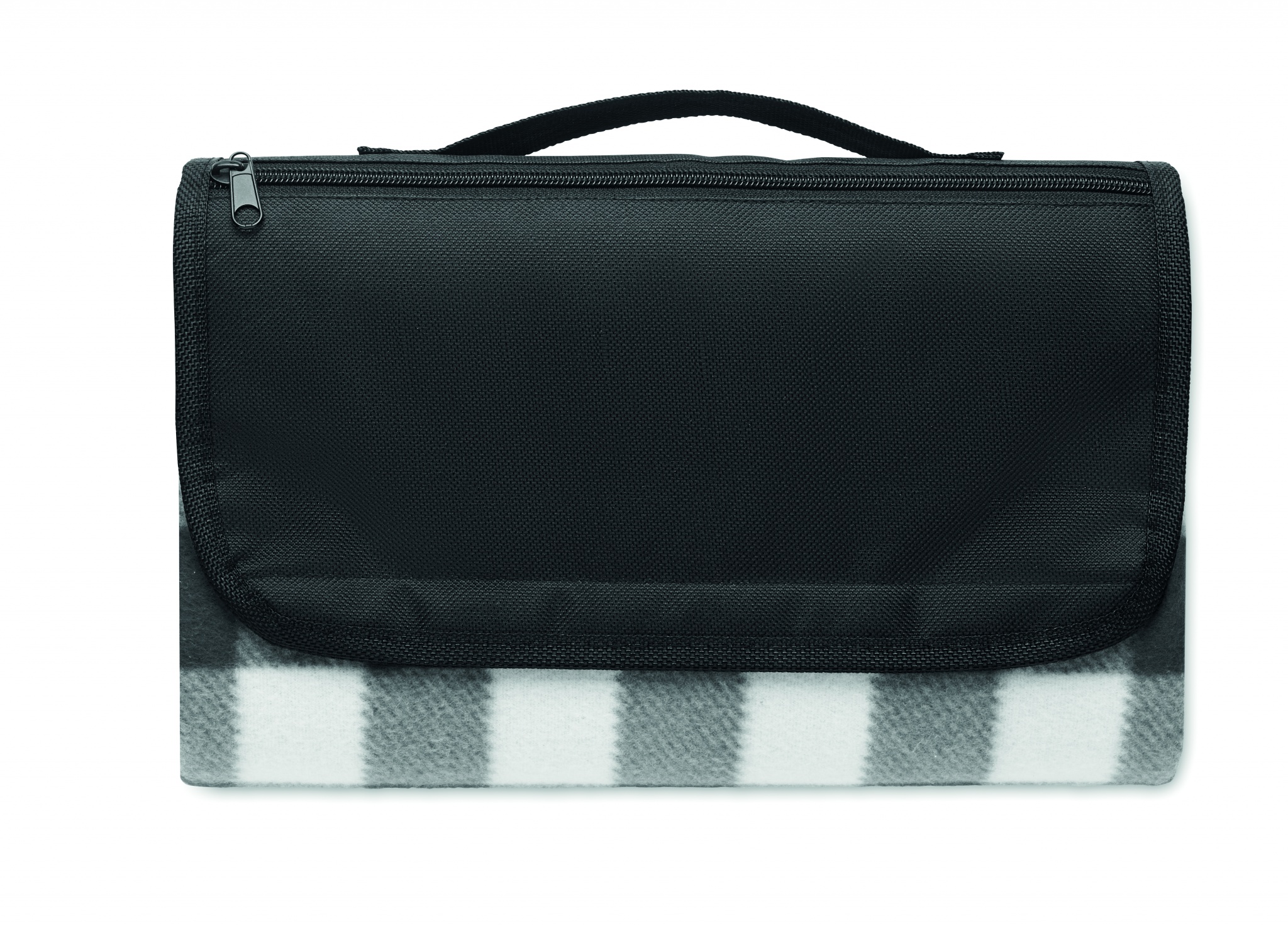 Faltbare Picknickdecke aus RPET Polar-Fleece 150 g/m² mit wasserabweisend beschichteter PEVA-Rückseite. Reißverschlusstasche auf der Vorderseite und kurzer Tragegriff .