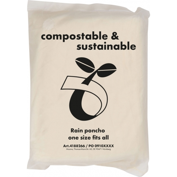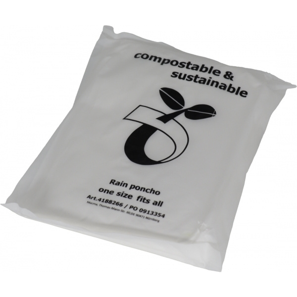 Phthalatfreier kompostierbarer Regenponcho aus PLA mit Tragetasche. Dieser Poncho ist eine nachhaltige Alternative. Ihr Logo wird auf die Tasche gedruckt.