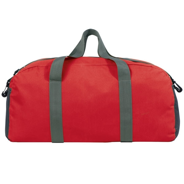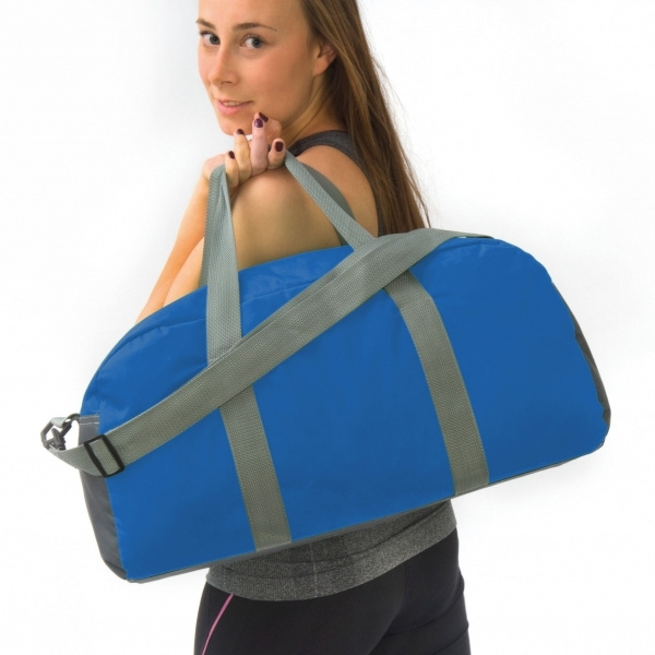 Große Sporttasche aus 600D Polyester mit großem Innenfach, Tragegriffen und verstellbarem Schultergurt. Ihr Logo drucken wir einseitig auf.