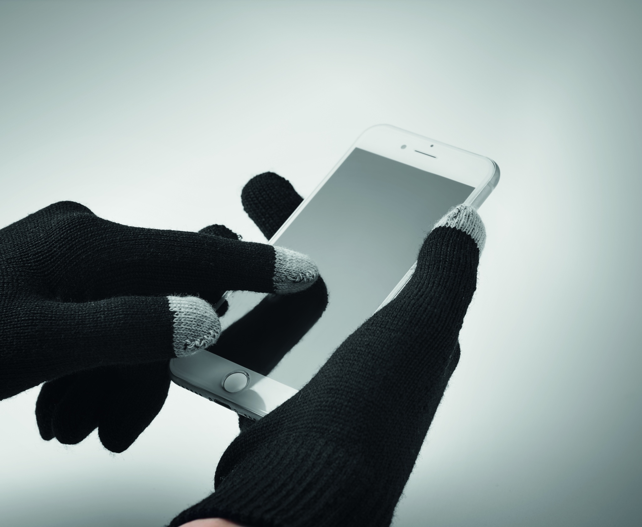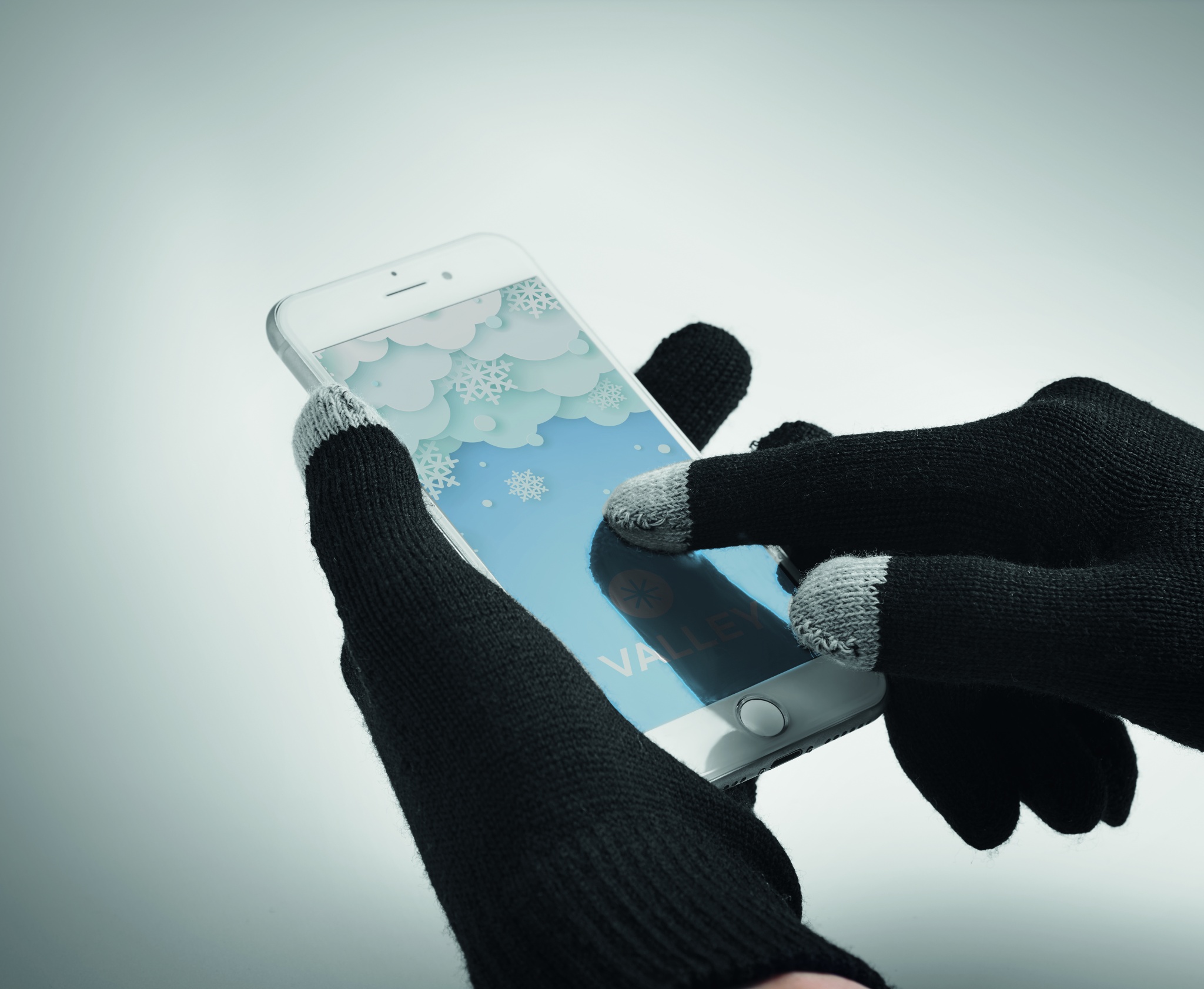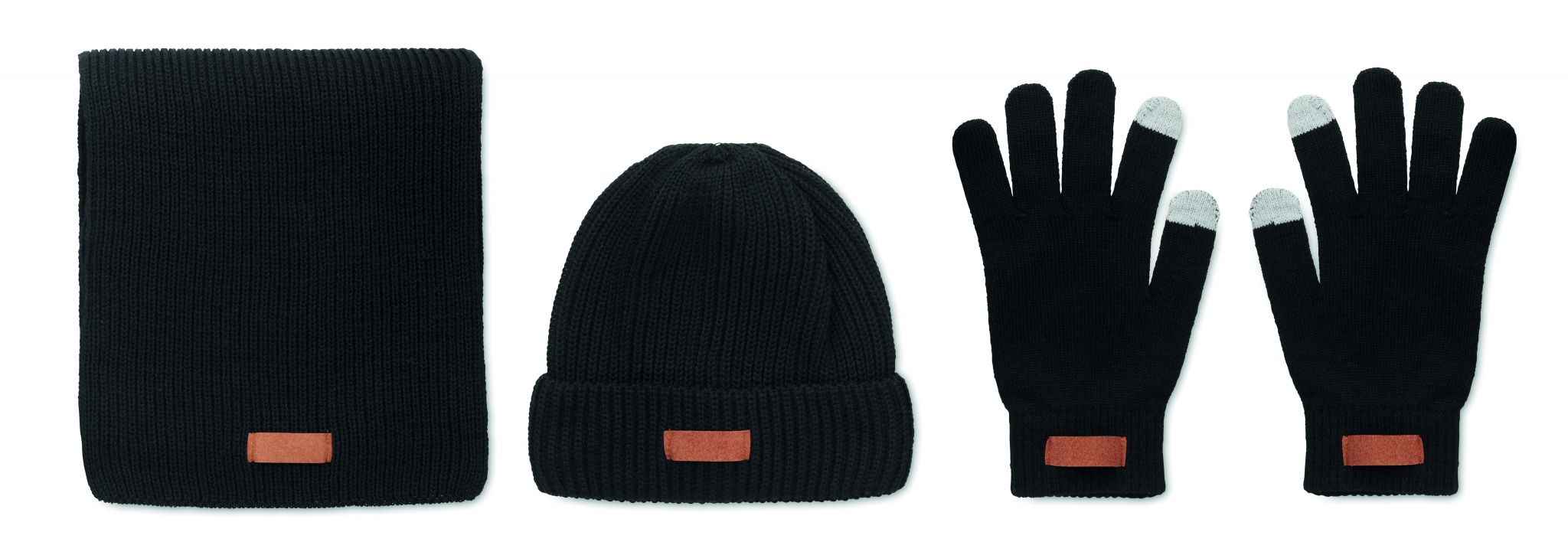 3-teilige Winter-Accessoires. Inklusive Mütze, Schal und taktilen Handschuhen aus RPET. Mit Label zur Werbeanbringung.