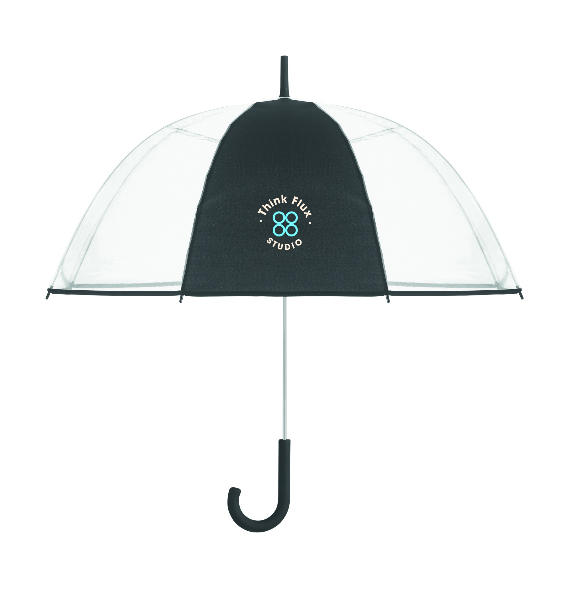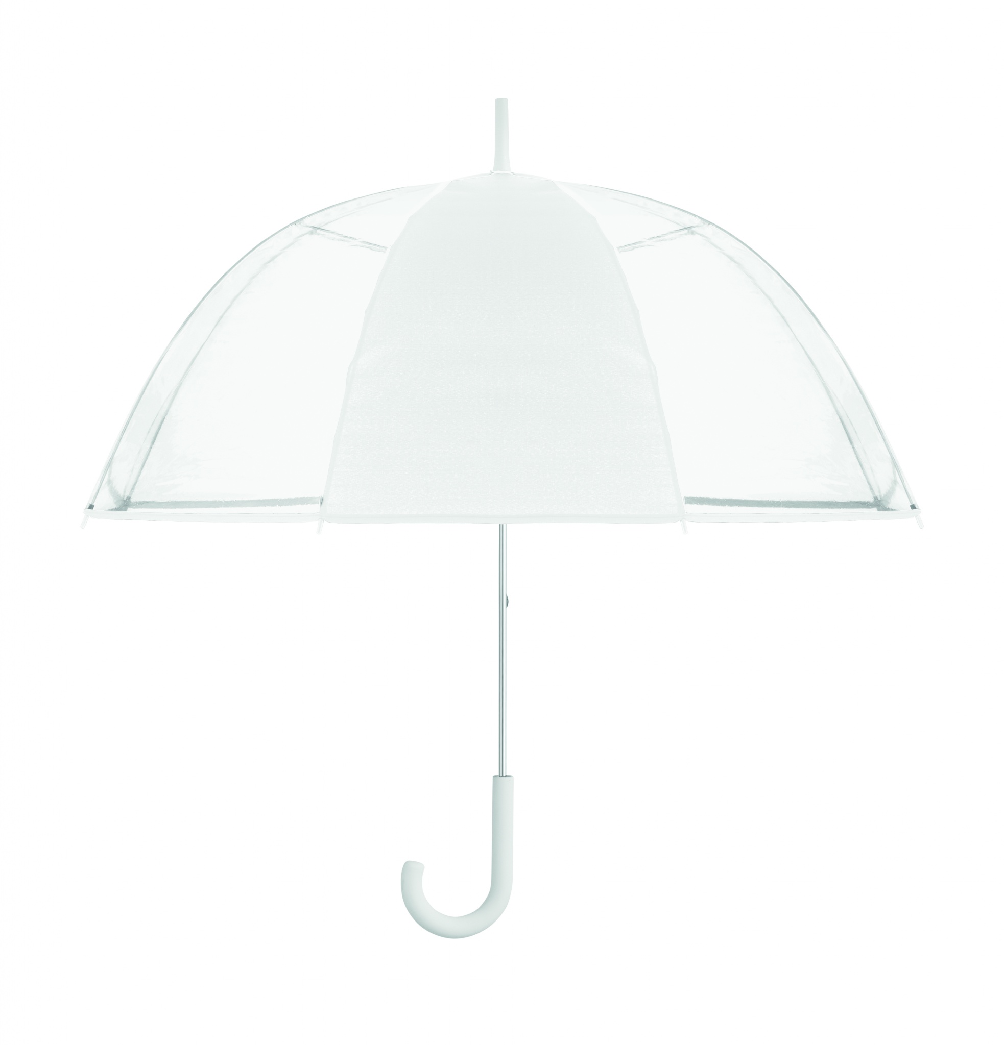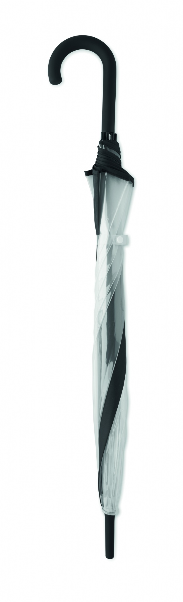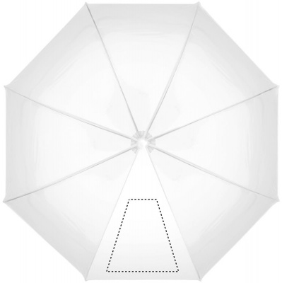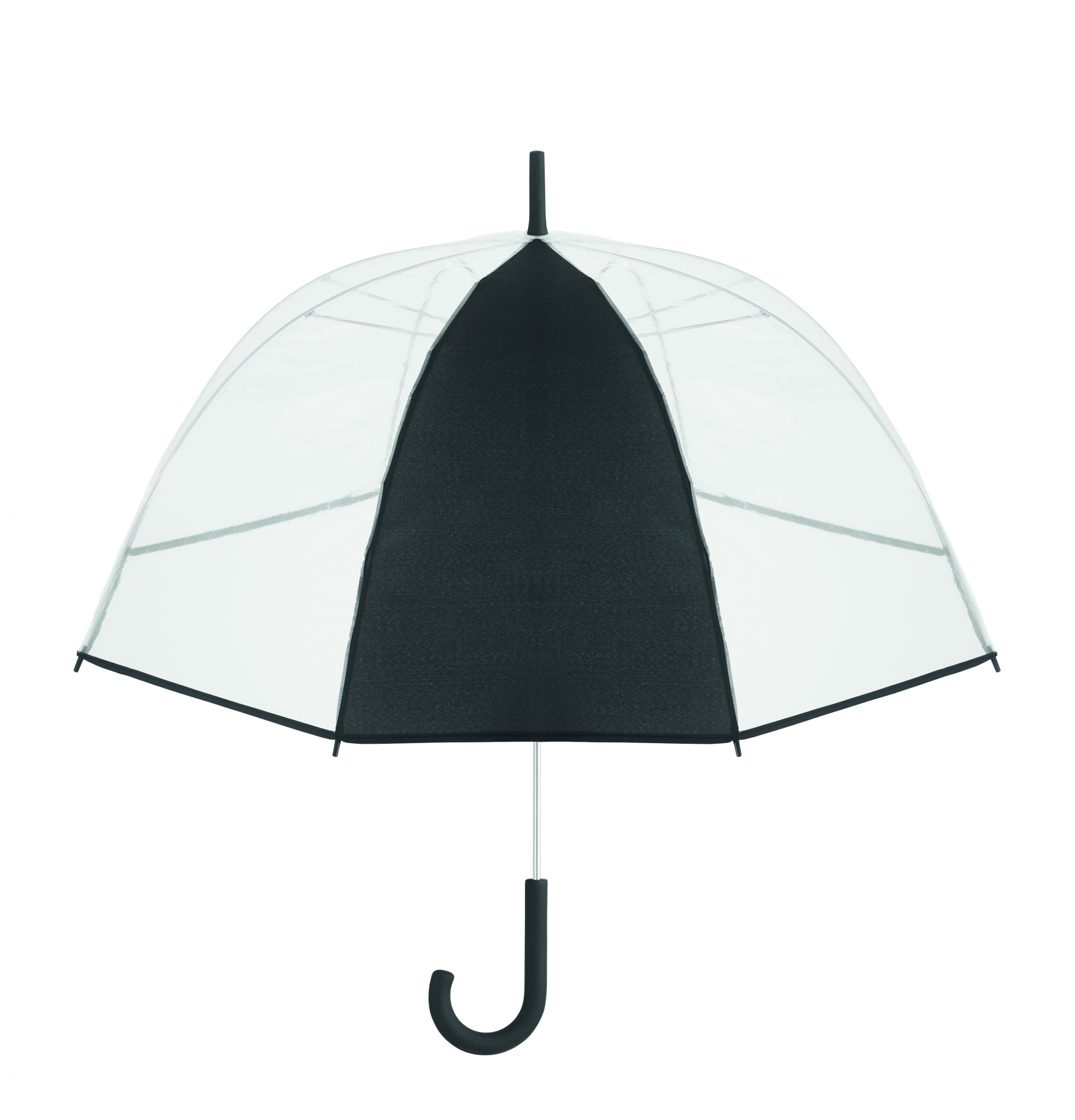 23 inch straight umbrella in POE with piping and 1 panel in polyester for printing area. Manual open. Fiberglass, ribs and frame. Chrome plated shaft with plastic tips. Rubber finished handle.