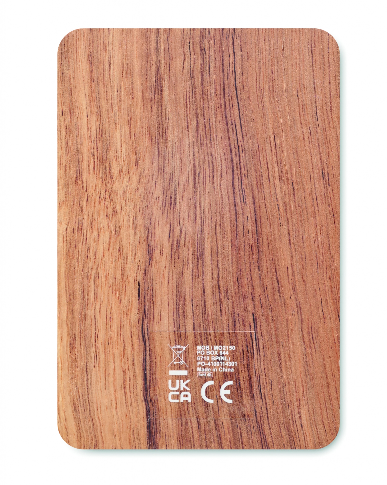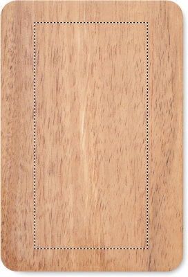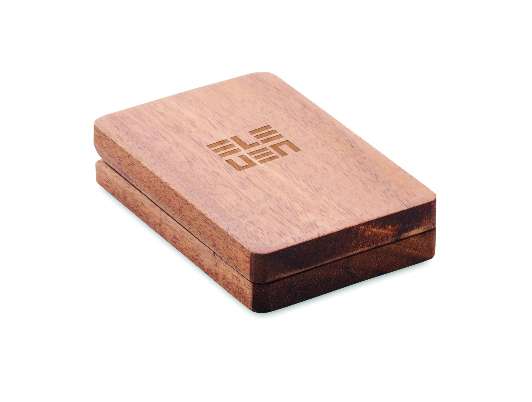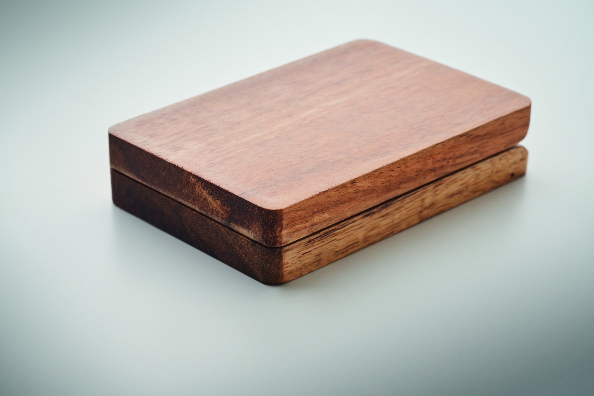3-in-1 charging cable with assorted connectors. Presented in acacia wood box. Type-C to Type C cable, C to USB-A, C to micro-B, C connectors.