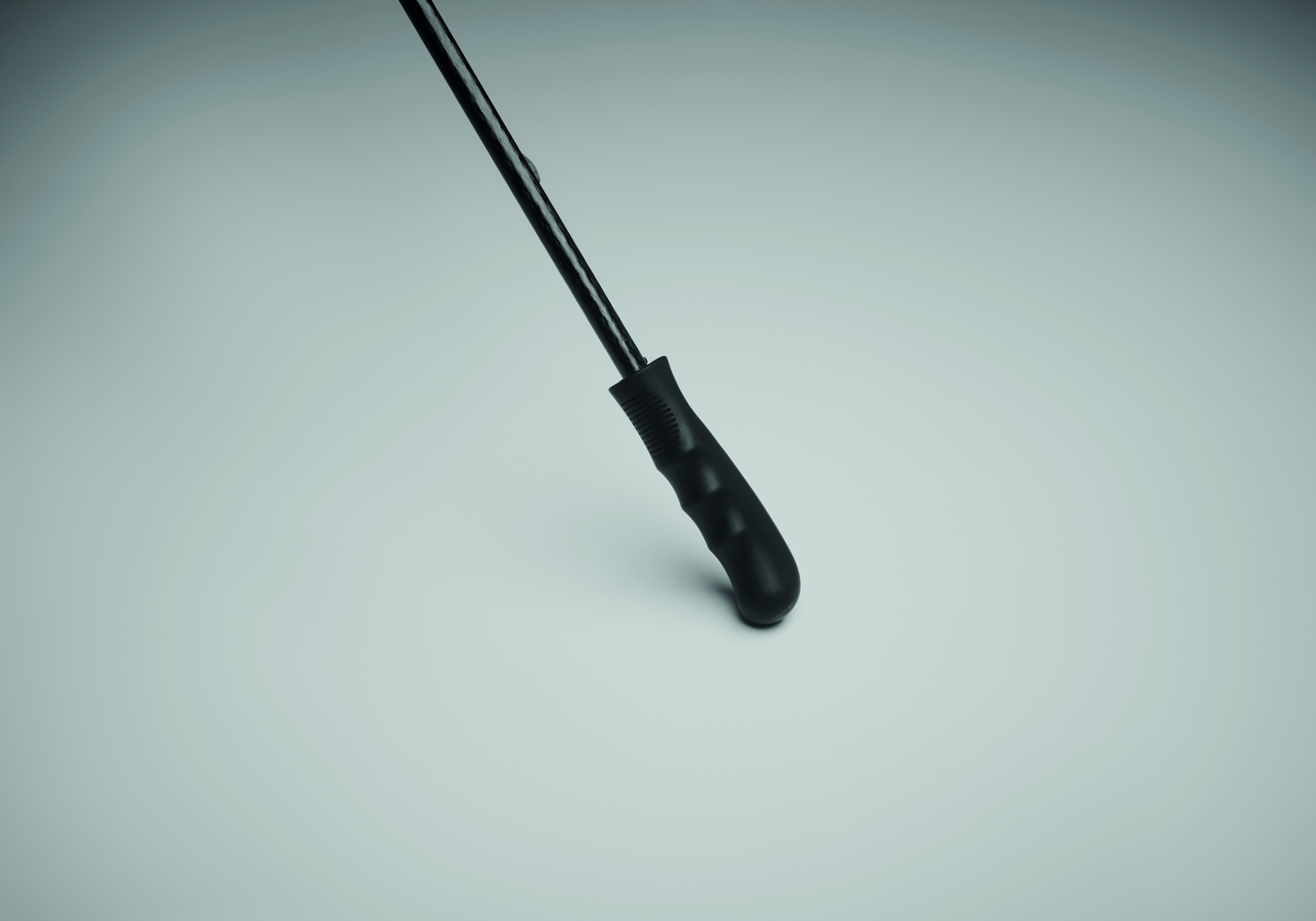 30 inch manual open windproof umbrella in 190T pongee (4 panels) and reflective material (4 panels) with fiberglass frame, ribs and shaft. Straight ABS handle with rubber finish. Manual closure.