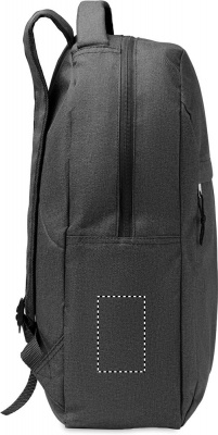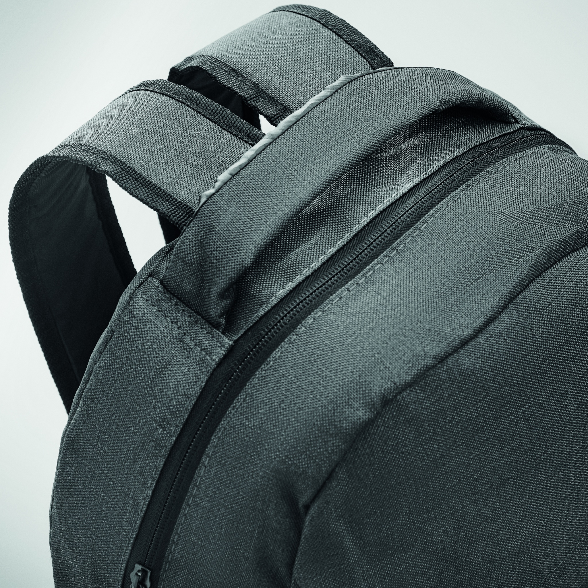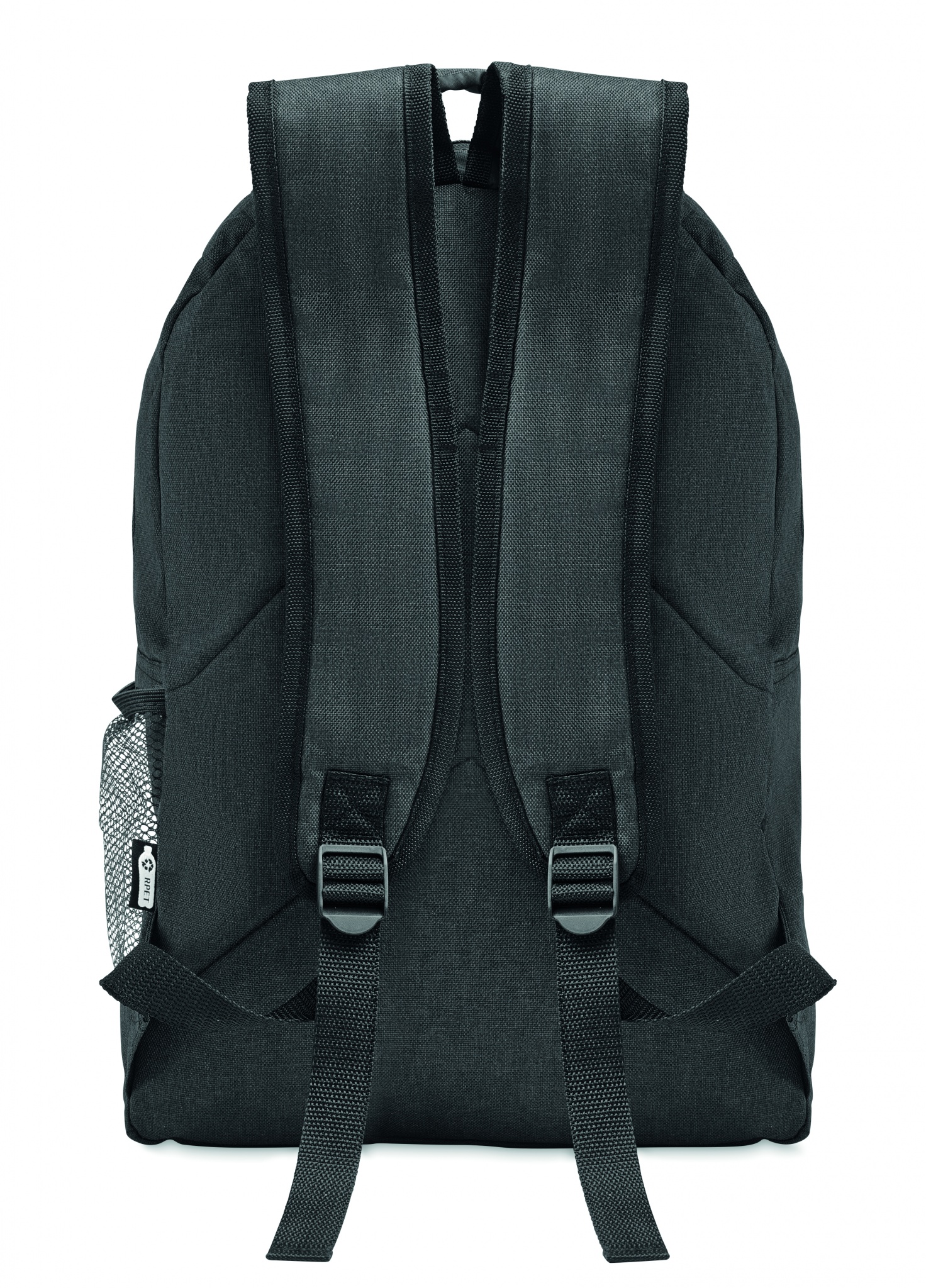 Backpack in 600D RPET 2 tone polyester with outside pocket with zipper and mesh pocket on the side.