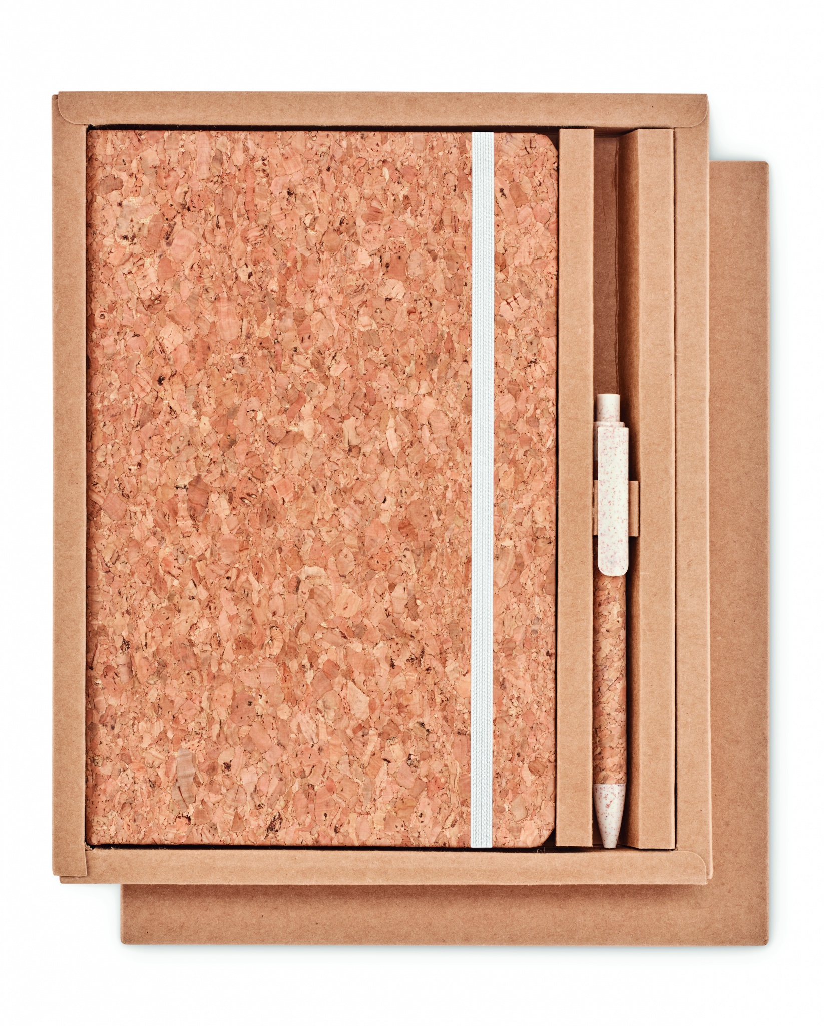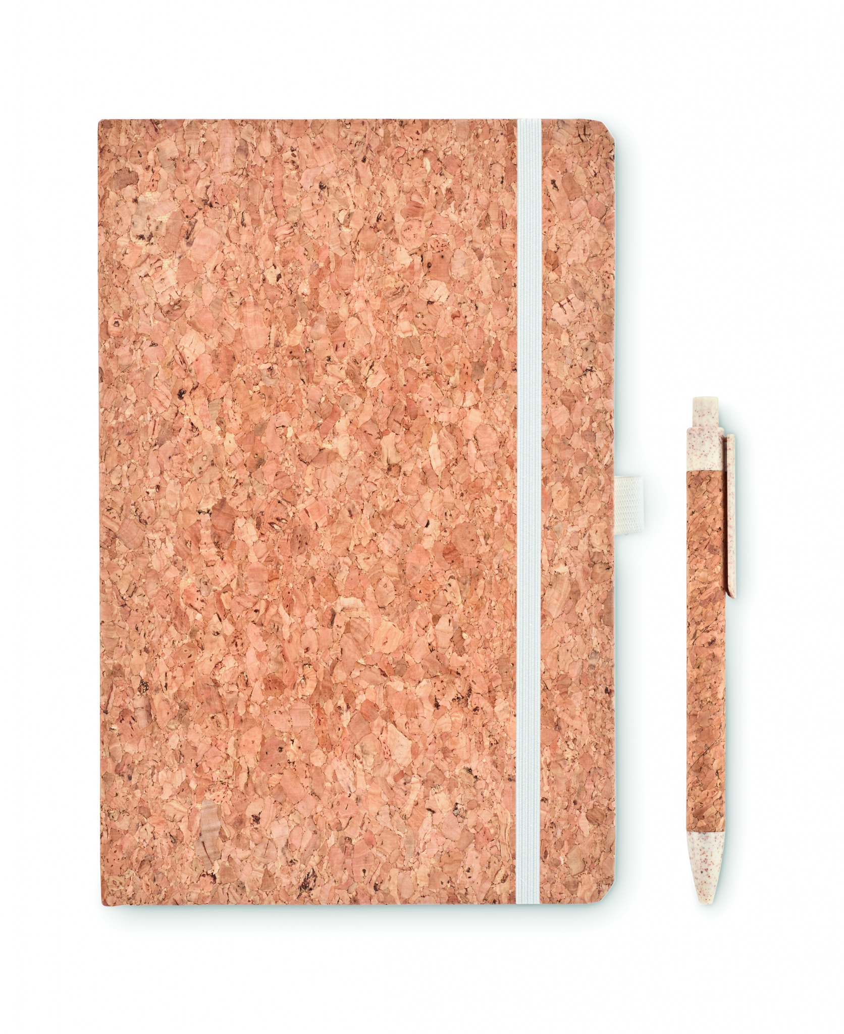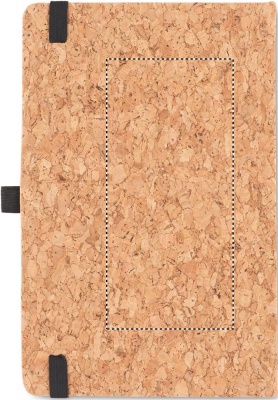 A5 cork notebook with matching pen. Hard cork cover. Casebound. 160 lined pages (80 sheets). Elastic closure strap and pen holder. Matching push button ball pen with cork barrel and 50% wheat straw and 50% PP details. Presented in a gift box. Cork is 100% natural material. Due to its structural nature and surface porosity the final print result per item may have deviations.