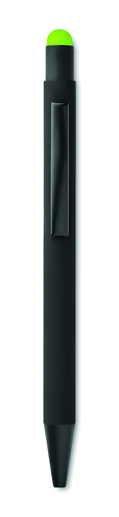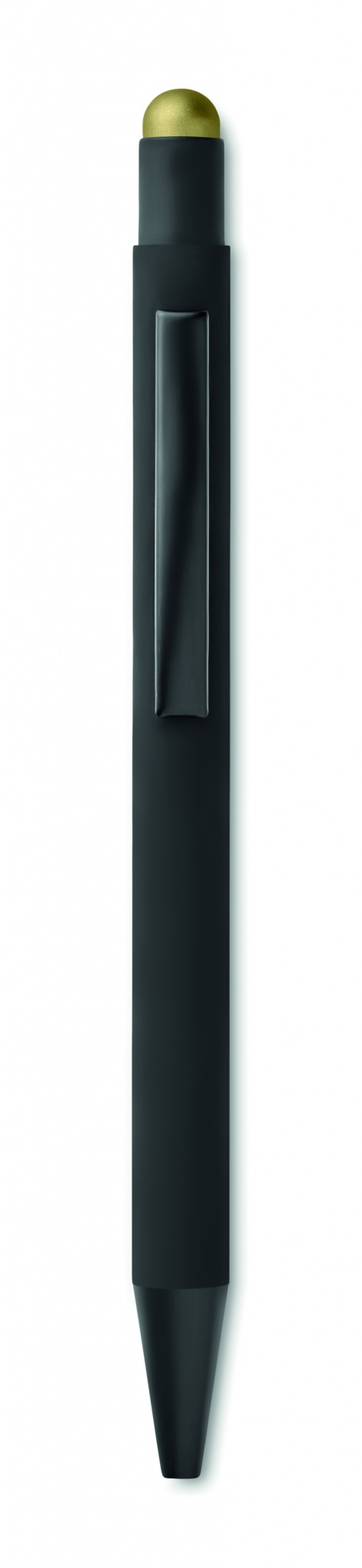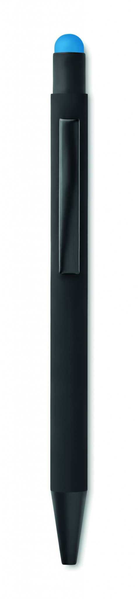 Push button stylus pen in aluminium. When the logo is engraved on to the barrel, the colour revealed matches the colour of the touch tip. Blue ink.