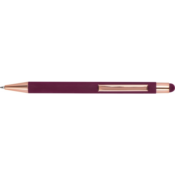 Ballpoint pen made of aluminum with a rubber finish surface, rose gold accents, and a touch pen. It is equipped with a blue-writing large-capacity plastic refill. Color of engravering: silver