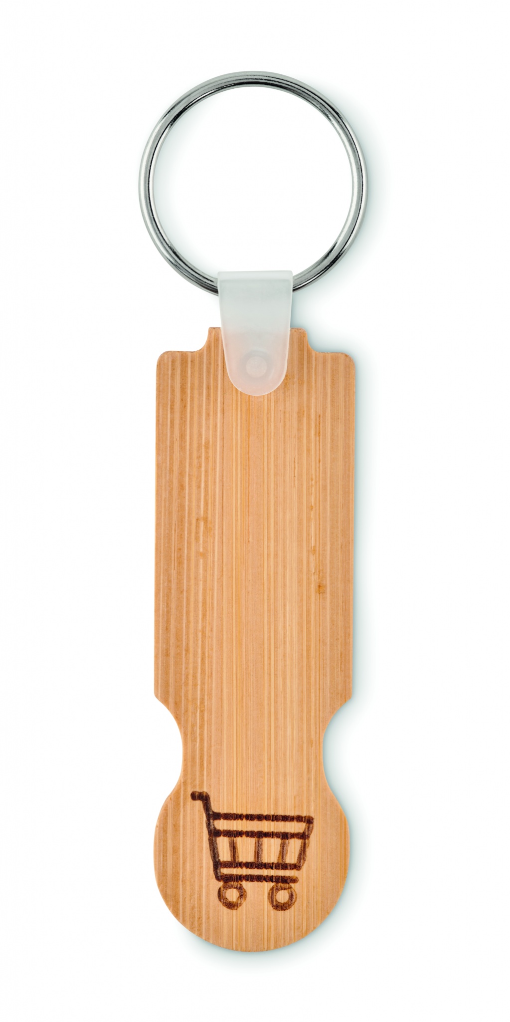 Bamboo key ring including euro token. Bamboo is a natural product, there may be slight variations in colour and size per item, which can affect the final decoration outcome.