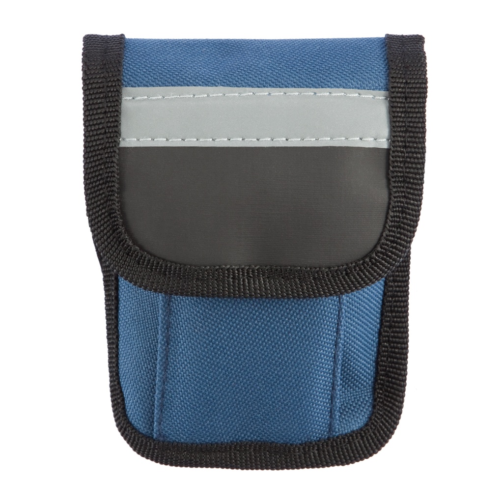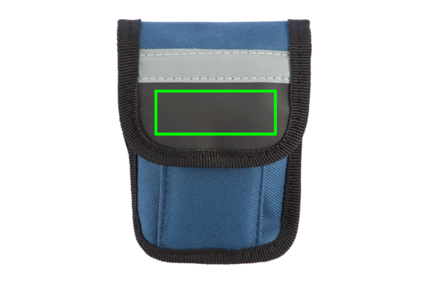 Blue pouch with reflective line on top, including 15 functions multitool with slotted screwdriver, cross-head screwdriver, nut driver, hex keys: 2mm, 2,5mm, 3mm, 4mm, 5mm, 6mm, wrenches: 8mm, 10mm, 15mm, spoke wrench: 14GE, sockets: 8mm, 9mm, 10mm, set with black plastic rack, 2 nickel plated tyre levers, tube glue, grinder and 3 rubber patches.
