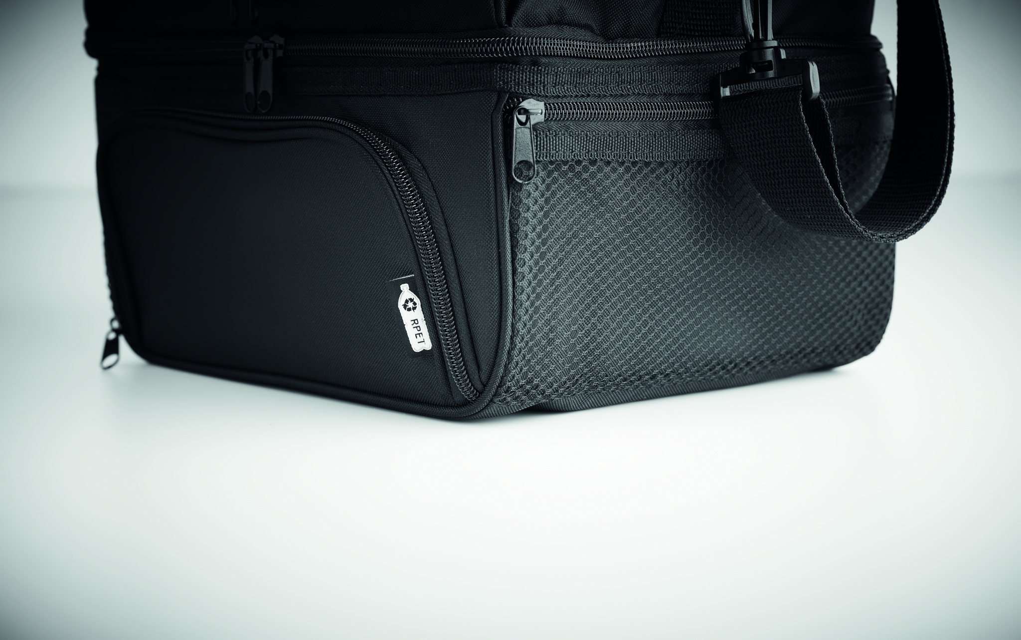 Insulated cooler bag in 600D RPET includes a reusable PP 1900ml capacity lunch box. With 2 sections to store hot and cold food separately. Adjustable and detachable shoulder strap. 2mm aluminium foil lining.