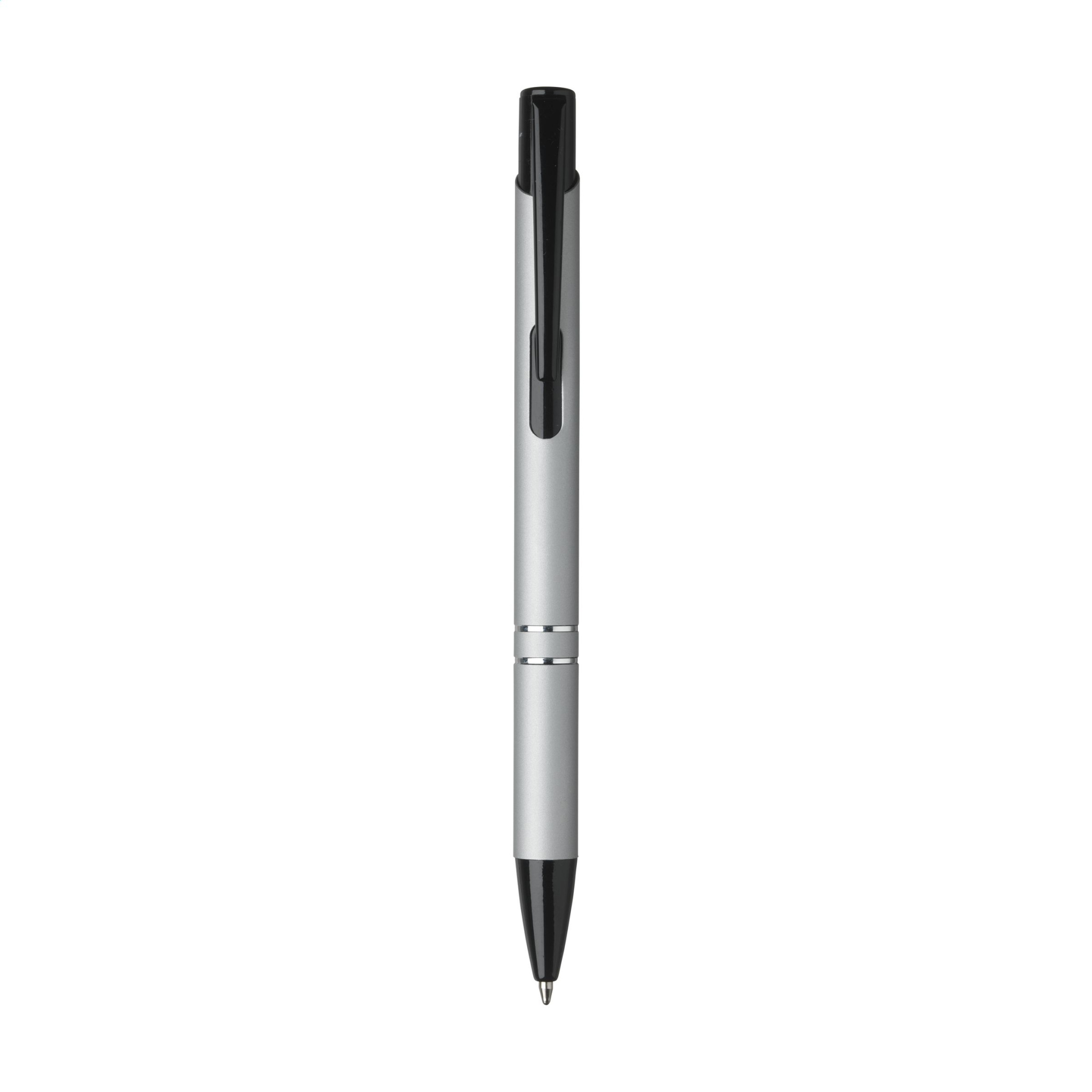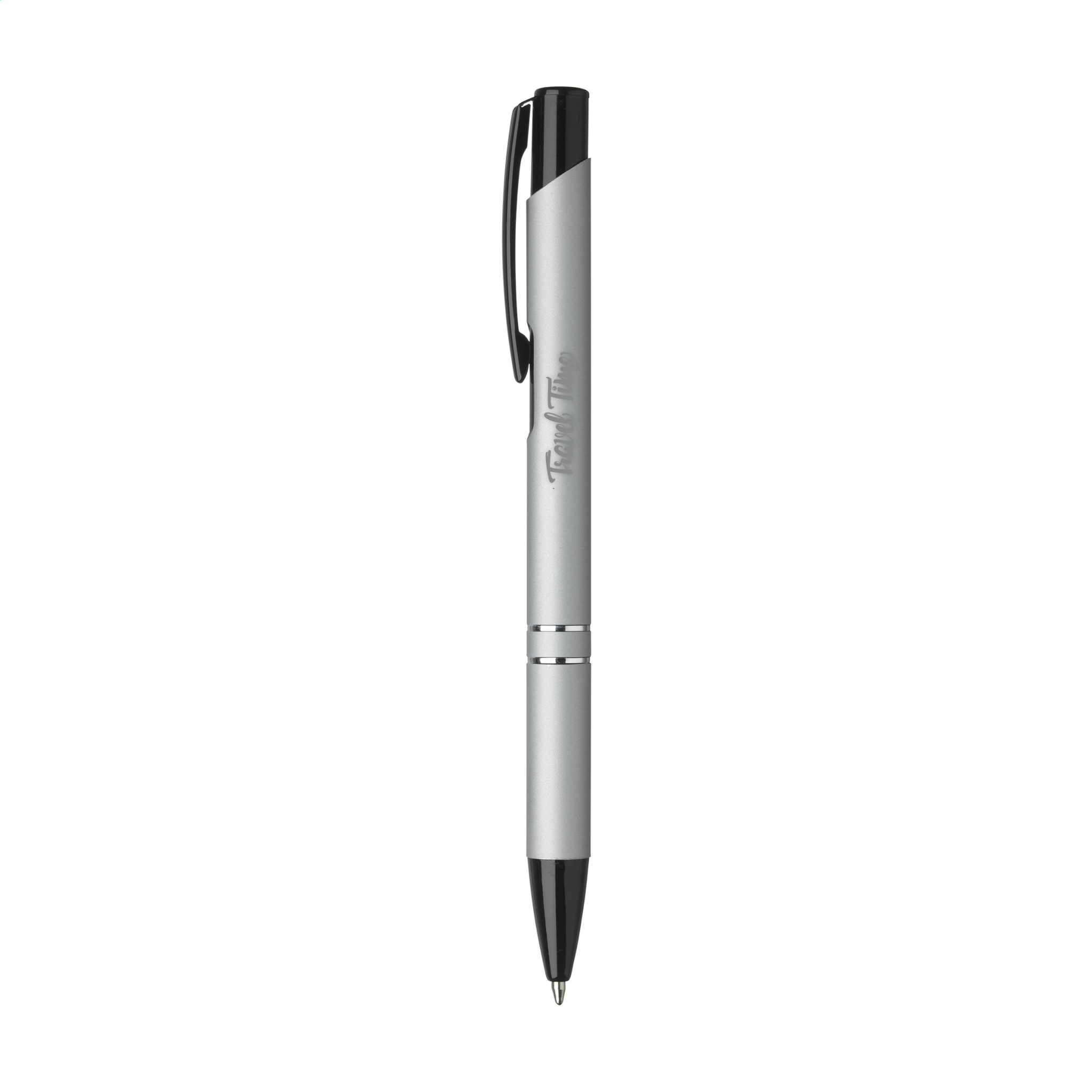 Blue ink ballpoint pen with black painted push button/clip and tip, chrome interlaces. The barrel is finished with a rubberised finish.
