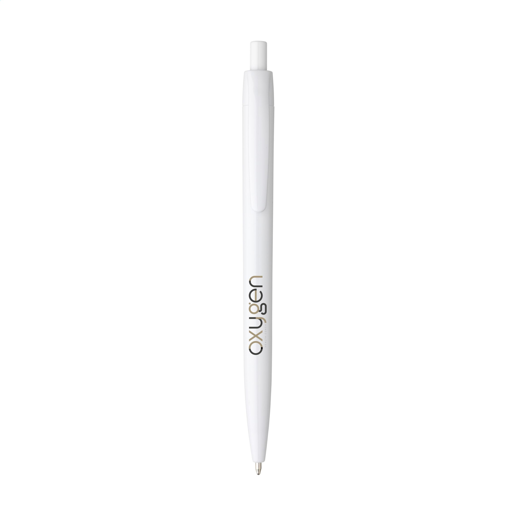 One-piece ballpoint pen with blue ink and white barrel. This pen has a large print area for optimal branding as well as a striking, coloured clip.