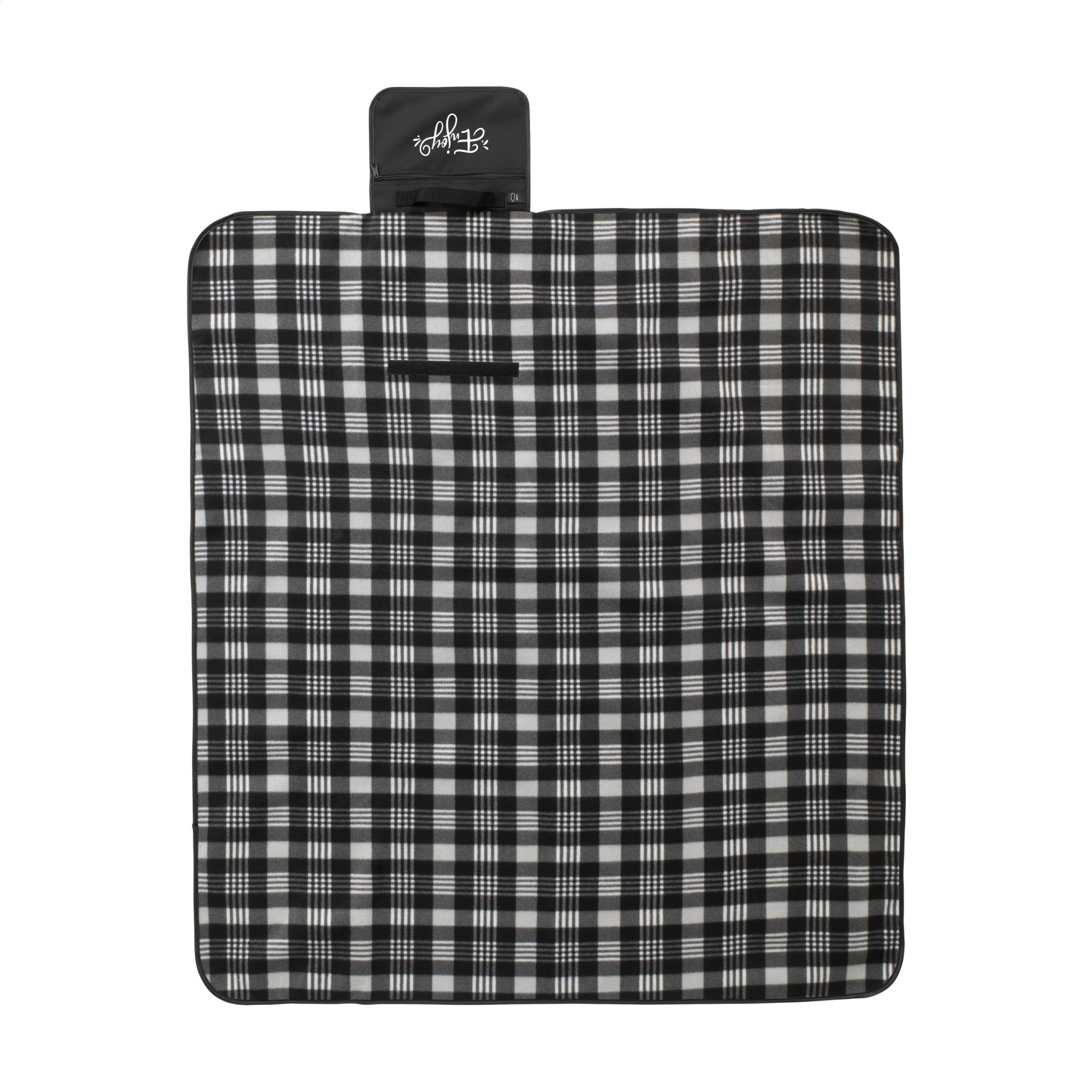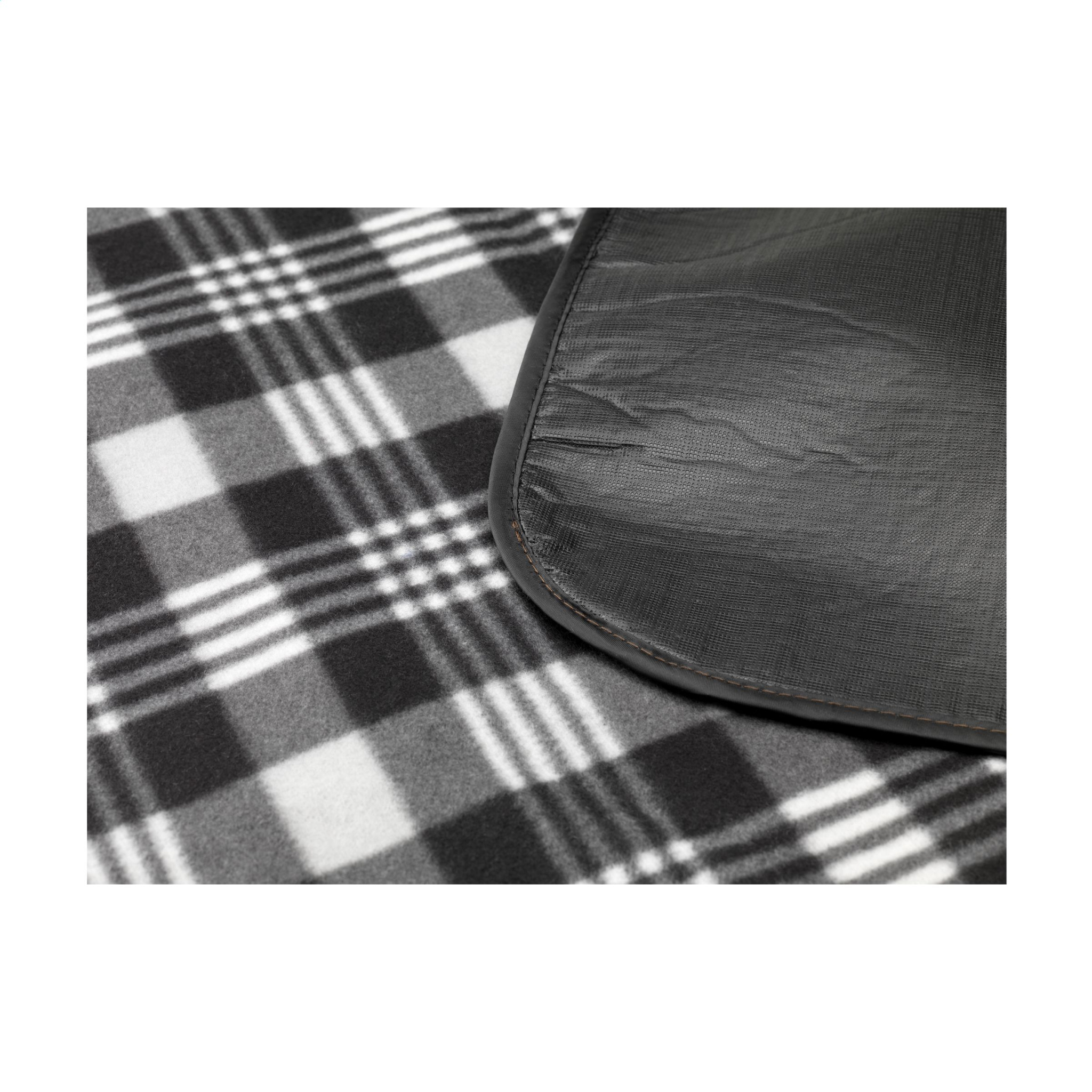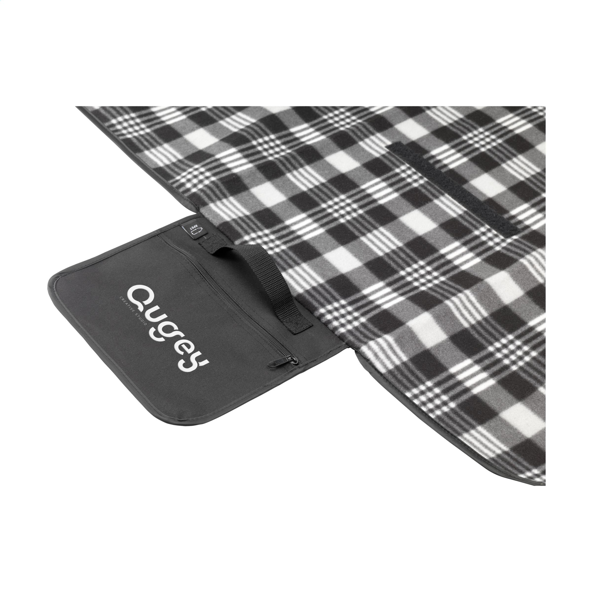WoW! Picnic blanket with a beautiful chequered pattern. The top layer is very soft and made from 100% RPET (130 g/m²). The underside is made from water-repellent PEVA and protects against moisture and dirt. Supplied with a zipper pocket, carrying strap and Velcro close. Easy to fold up and carry. GRS-certified. Total recycled material: 55%. Dimensions when unfolded 121 x 135 cm.