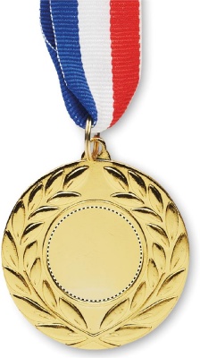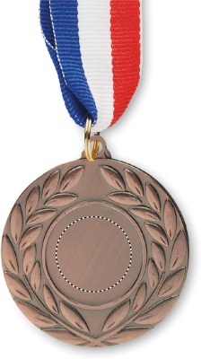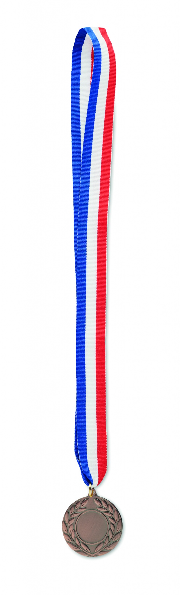 Medal made of iron with polyester strap in blue, white and red colours. 5 cm diameter