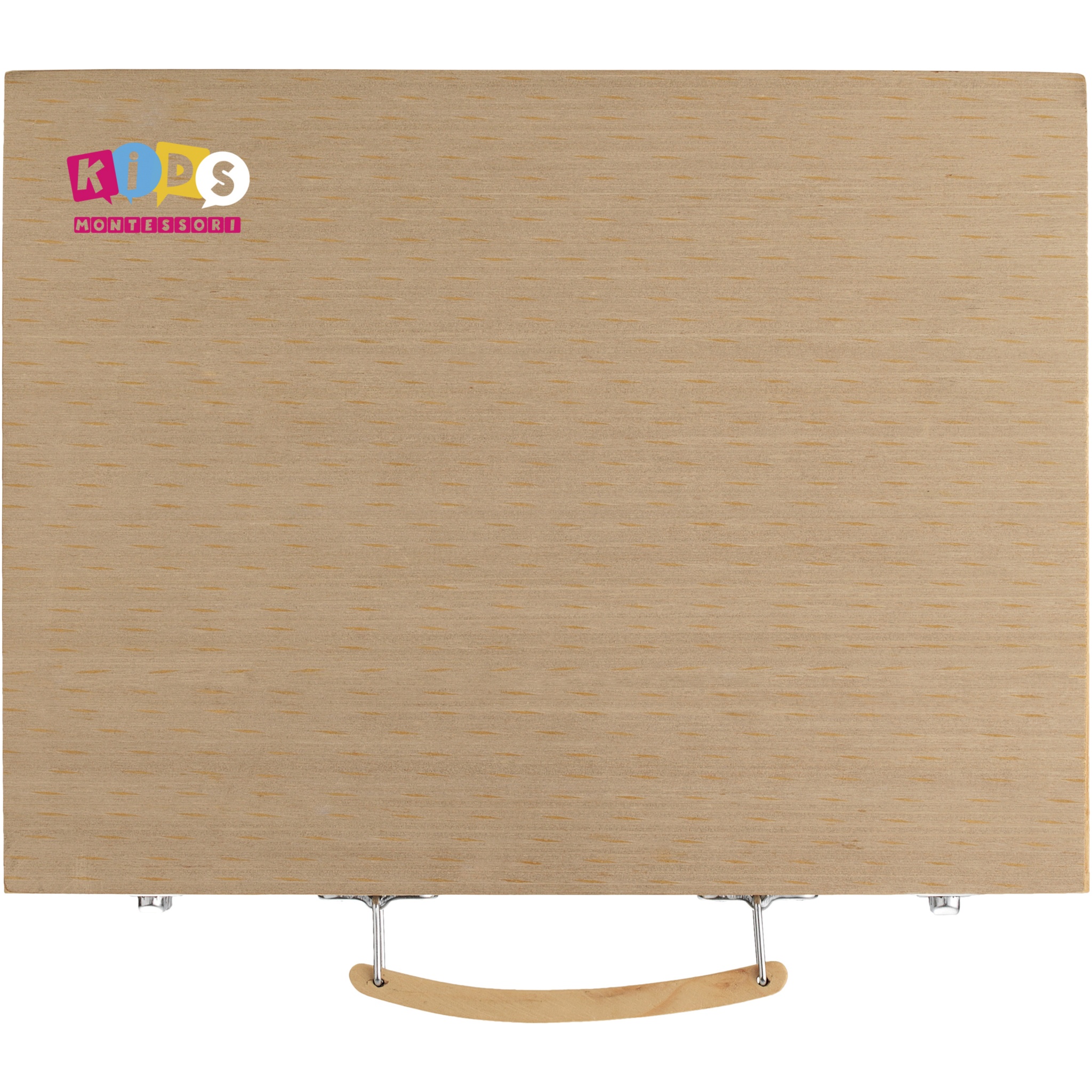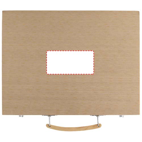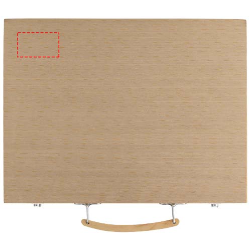 Set of 12 water paint colours, 12 coloured pencils, 12 colouring pens, 12 oil pastels, 12 crayons, palettes, glue, eraser, sharpener, HB pencil and paint brush presented in a wooden case. Decoration not available on components.