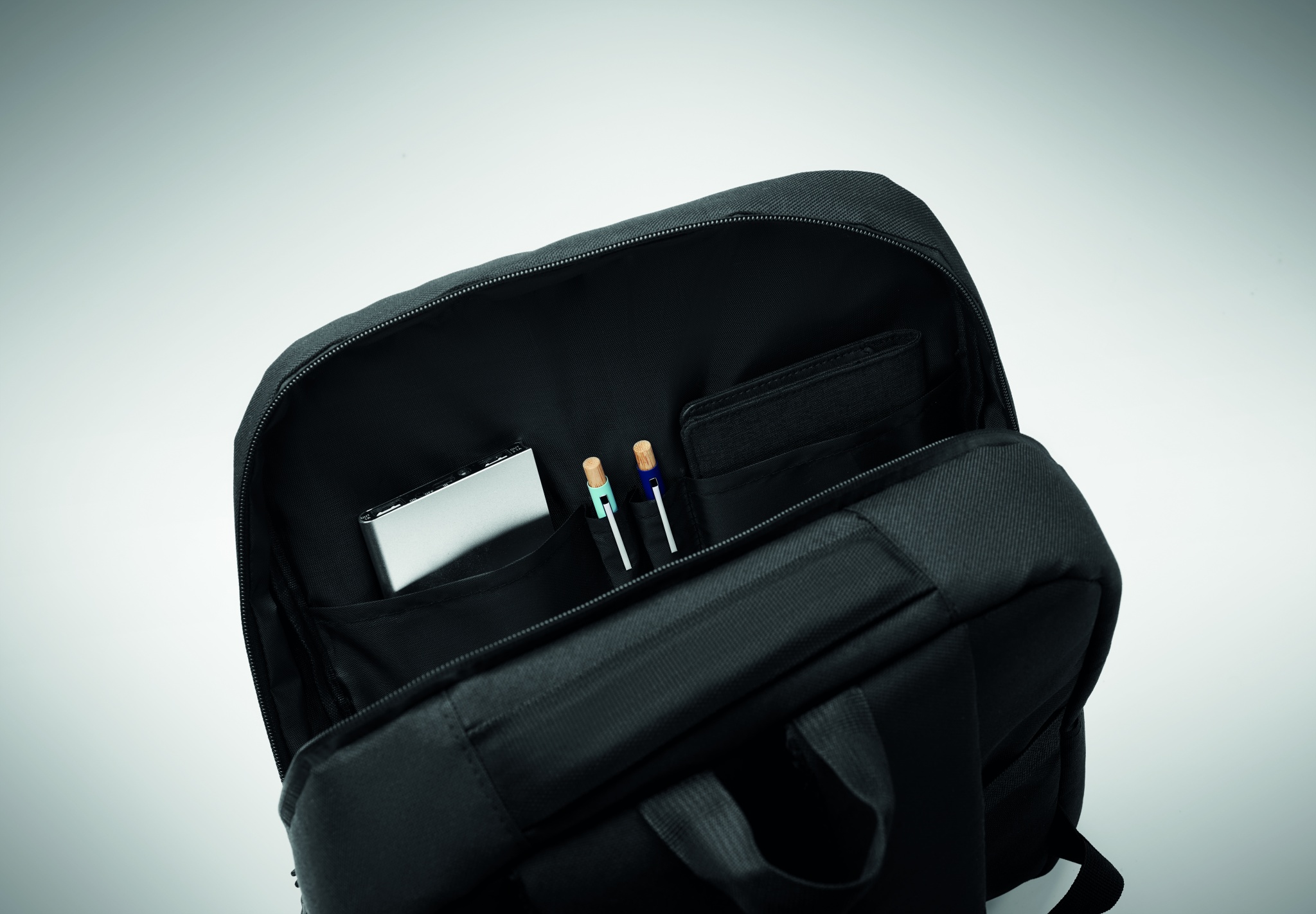 Slim backpack in 600D RPET polyester and 210D lining. Has 15 inch laptop compartment, a 10 inch tablet outside zippered pocket, 2 internal pockets, 2 internal pen pockets, zippered front pocket. 2 side pockets. Soft padded back and shoulder straps. Suitcase sleeve.