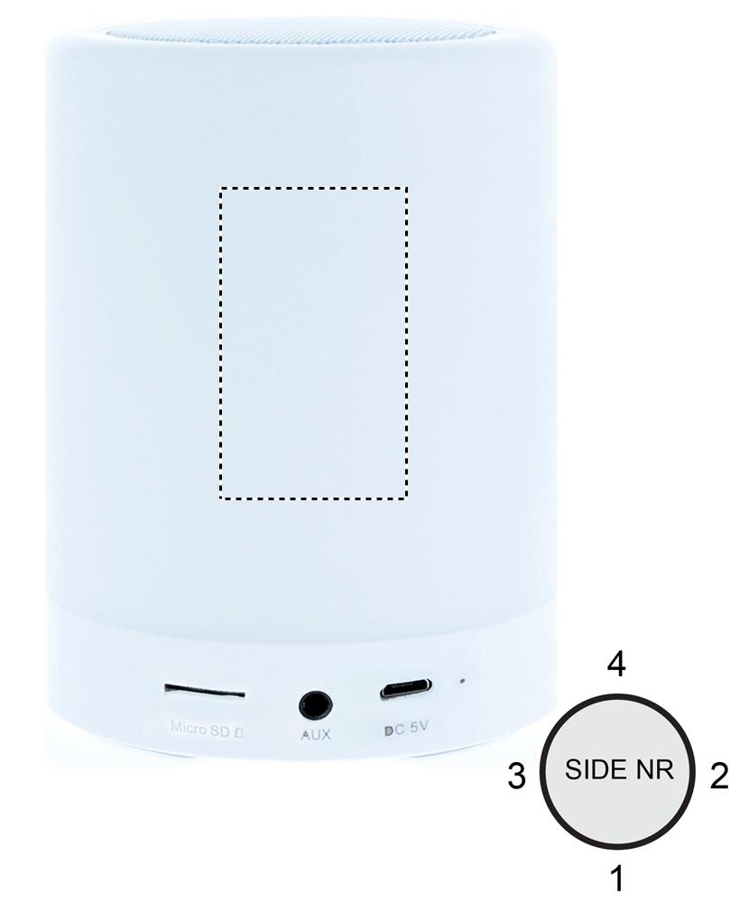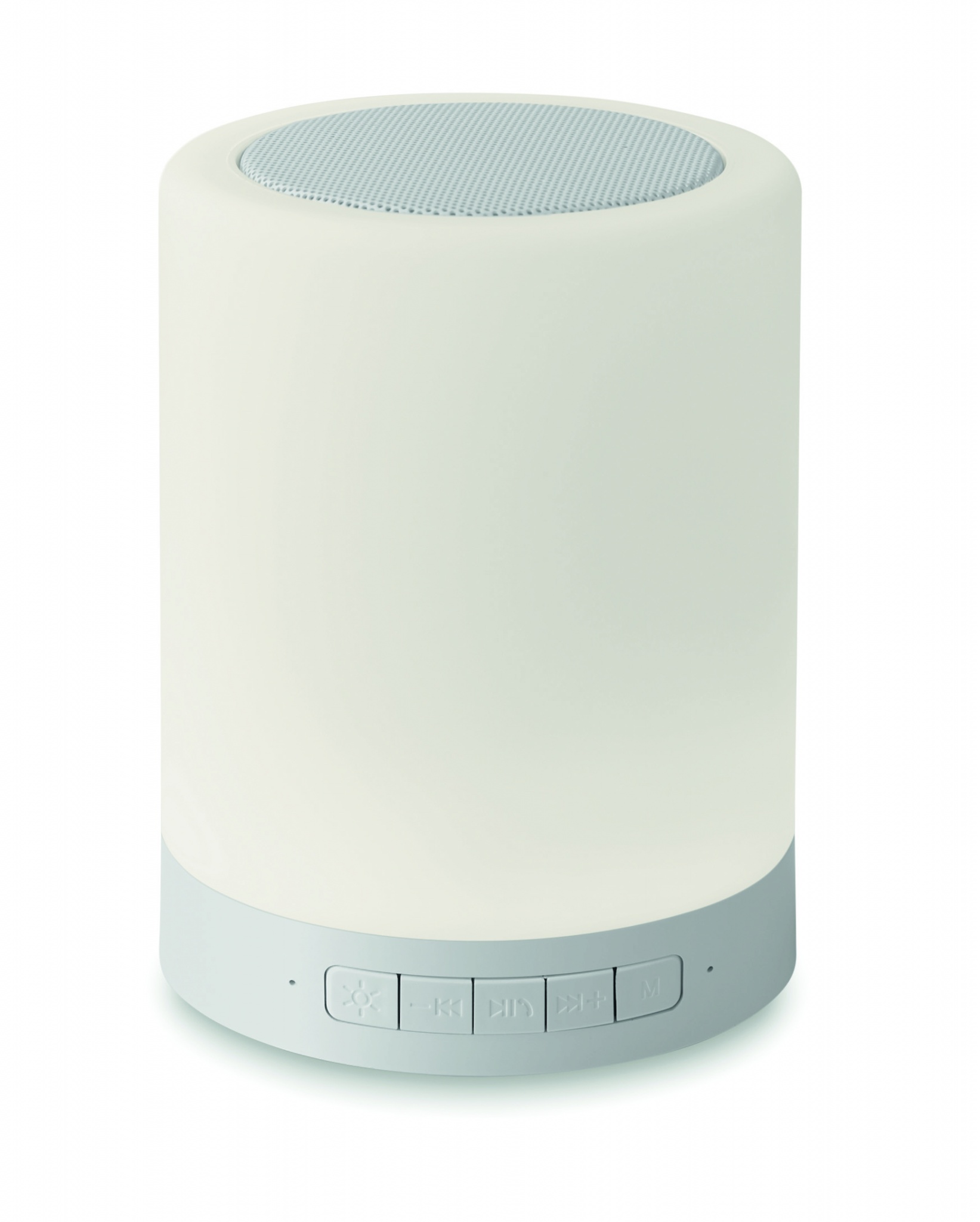 Table or camping wireless speaker with hands free function, SD card slot and regulating colour and brightness touch. 6 colours changing light. Rechargeable Li-Ion 2000 mAh. Output data: 3W. Playing time aprox. 2h.