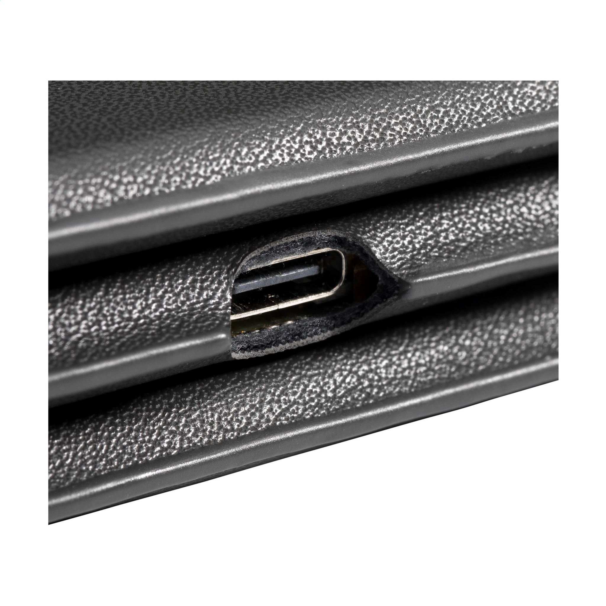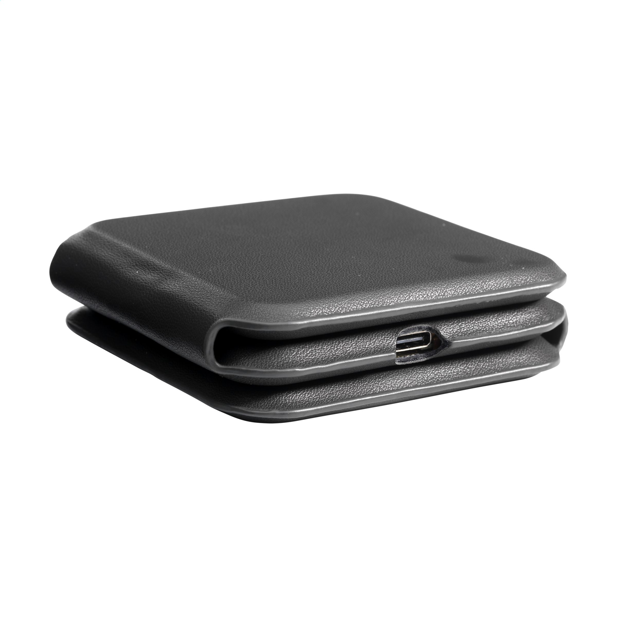 Foldable 3-in-1 fast charger made from recycled PU. The ideal wireless charger for quickly charging your phone, earphones and smartwatch simultaneously. Foldable and compact. Equipped with a magnetic Apple Watch section for wireless charging 2.5 W. TWS earphones have a wireless output of 3 W. Input: Type-C 9V/3A. Wireless output: 15 W. This charger can be used anywhere and is ideal to take with you when travelling. Includes protective case made of recycled PU with drawstring. Includes a black rTPE charging cable Type-C connection and A/C connector, as well as a handy set of instructions. RCS certified. Total recycled material: 44%. Each item is supplied in an individual brown cardboard box.