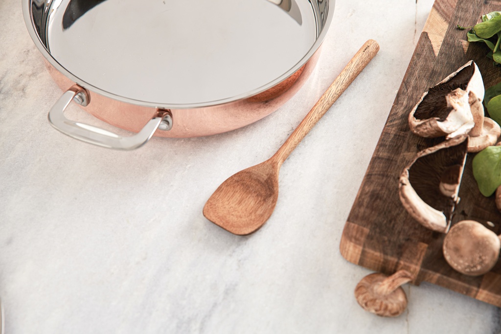 Exclusive tri-ply copper sauté pan with lid. The first layer is the copper exterior and the interior consists of a layer of aluminium and a layer of stainless steel, which make it easy to clean. The copper and aluminium layers conduct heat well, allowing the pan to heat up quickly and evenly. The base has been reinforced with a thicker stainless steel plate which allows for use on an induction hob. The pan has a stainless steel handle that stays cool during cooking. Suitable for all types of hobs.