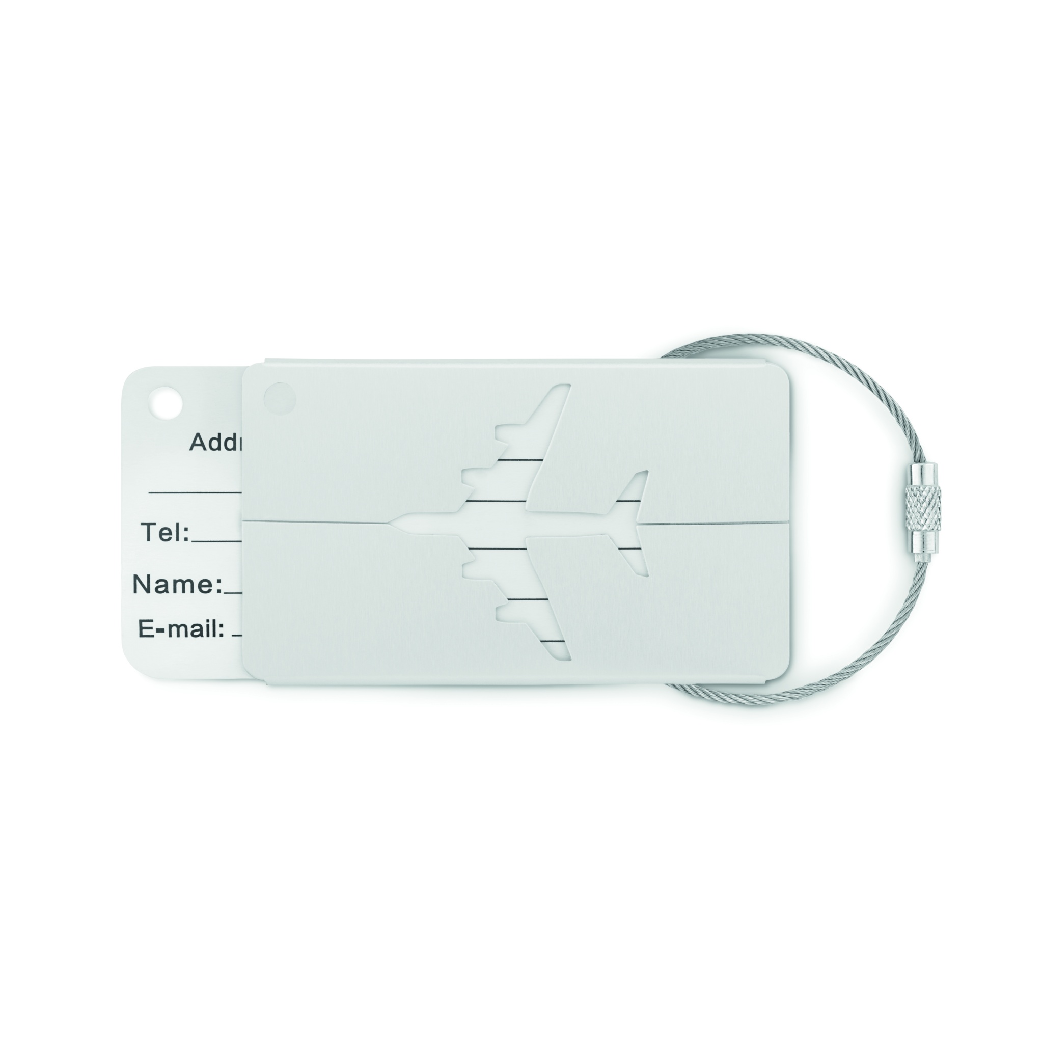 Alumiiniumist lennukipagasi silt nime ja aadressisildiga. Kaasas metallnöör ja kruviühendus.