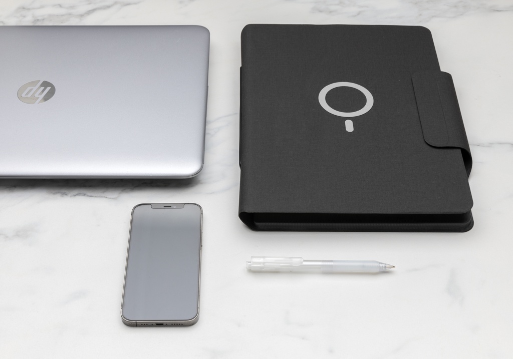 Laadige oma mobiilseadet juhtmevabalt täiskiirusel selle A4 PU materjalist sülearvutiportfelliga, millel on integreeritud magnetiline 10 W juhtmevaba laadija ja 8000 mAh akupank. Kinnitage telefon (iPhone 12 või uuem) juhtmevaba laadija külge ja telefon joondub ideaalselt sees olevate magnetitega. 10 W juhtmevaba laadija ühildub kõigi QI seadmetega (Iphone 8 ja uuemad ning Android seadmed) Type-C sisend 9V/2A; Juhtmeta väljund 9V/1,1A; Type-C väljund 9V/2A. Märkmik sisaldab 20 lehte/40 lehekülge 80 gsm joonelist paberit. Telefoni/tahvelarvuti tasku ja pliiatsi aasaga. Integreeritud 19 tk kvaliteetset N52H kuumakindlat magnetit. Registreeritud disain.