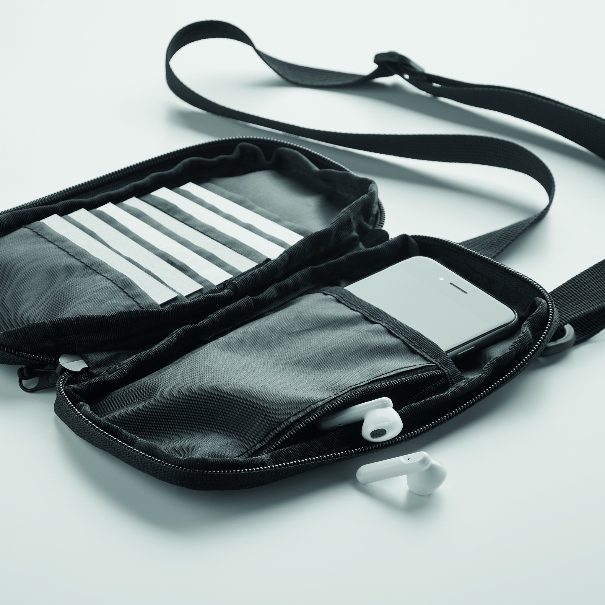 Universaalne risti korpusega nutitelefoni kott reguleeritava rihmaga 300D RPET polüestrist. Ees ja küljes lukuga tasku. Põhisahtlis on mitu taskut.