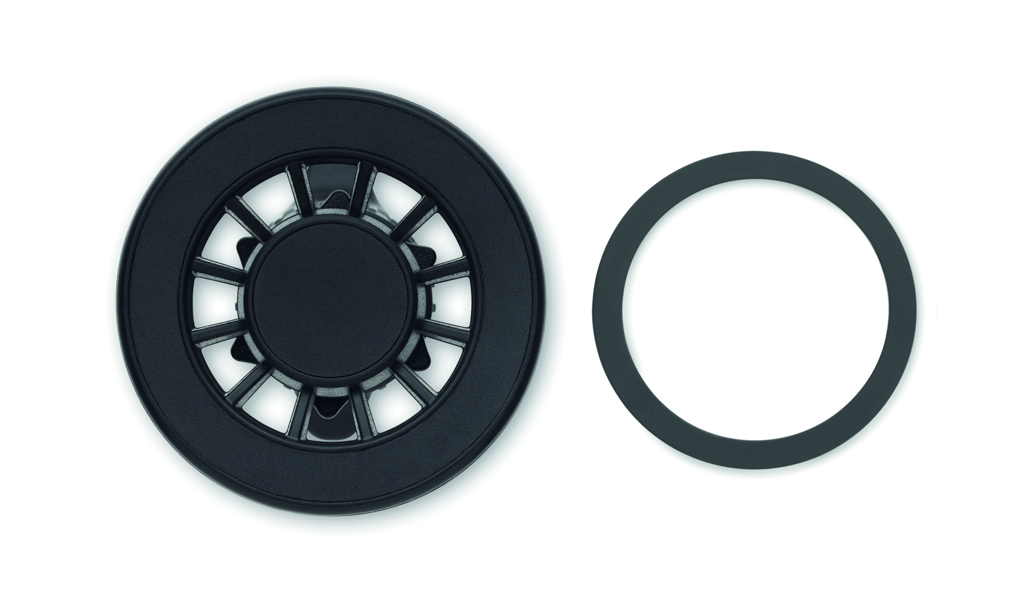 360 kraadi pööratav magnetiline õhuavaga ABS-ist telefonihoidik. Sisaldab täiendavat magnetilist metallrõngast, mis toetab mittemagnetiliste juhtmevabade laetavate telefonide laadimist.