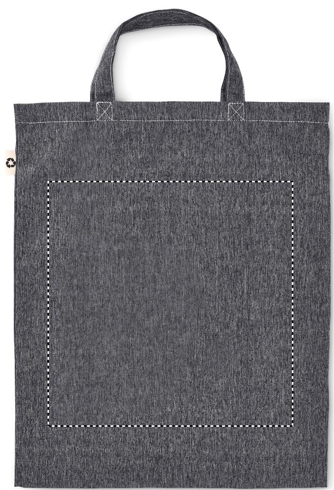 Kokkupandav 2-tooniline taaskasutatud puuvillast ja taaskasutatud polüestrist pikkade sangadega ostukott (20%/80%). u. 140 gr/m². See üksus võib pärast printimist kokku tõmbuda.