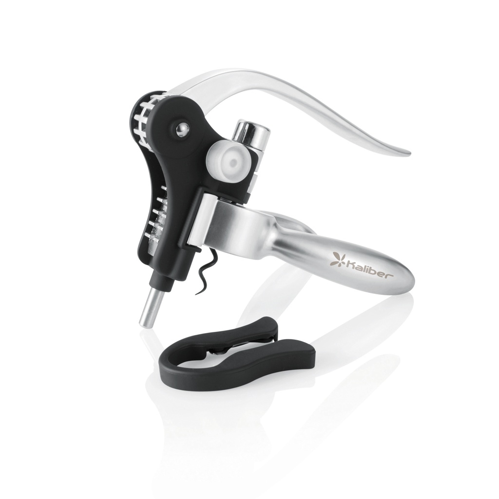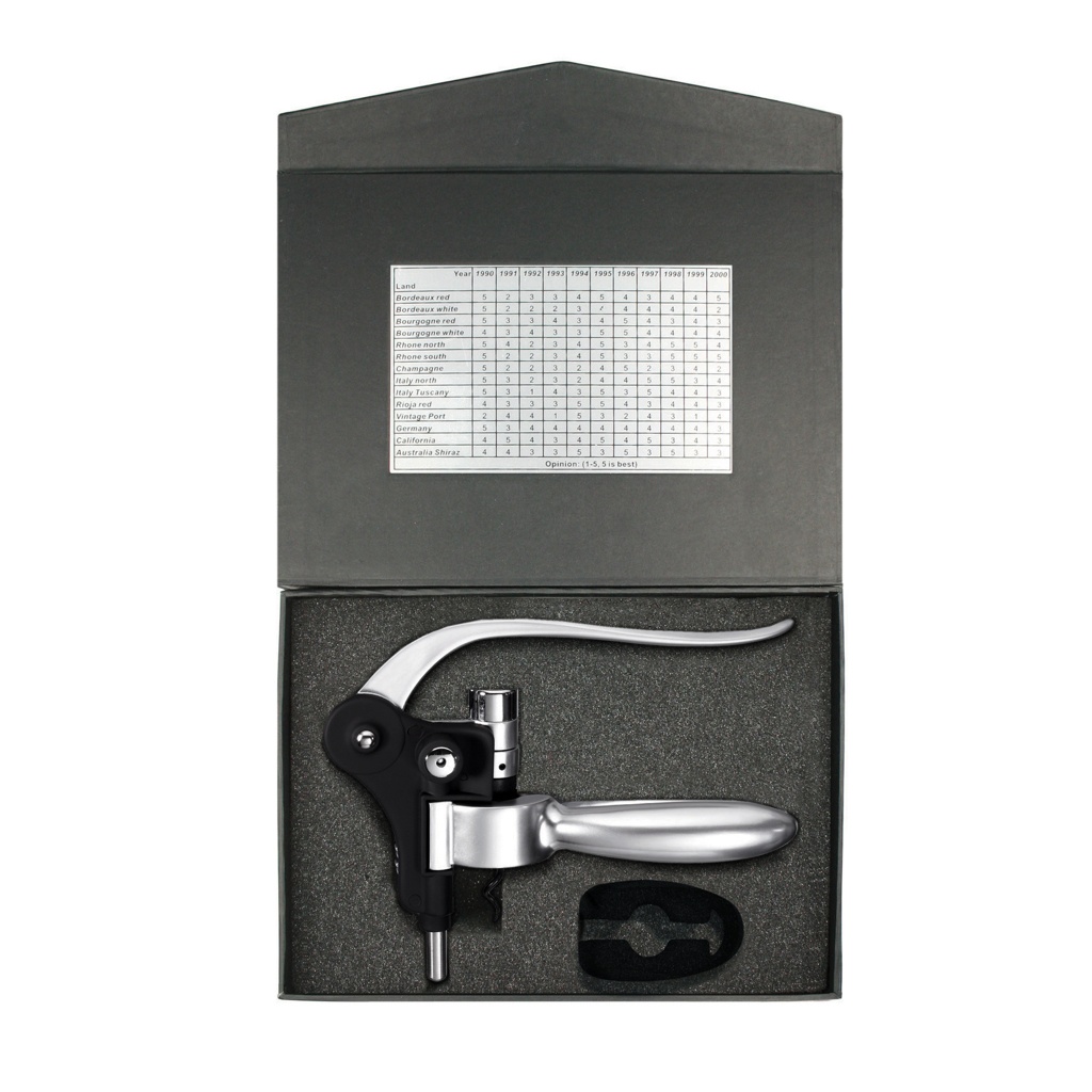 Alumiiniumist, karastatud terasest ja teflonkattega spiraalist valmistatud kangimehhanismiga korgitser, sealhulgas fooliumilõikur ja tahvel koos ülevaatega parimatest veinipiirkondadest 1990. aasta seisuga.
