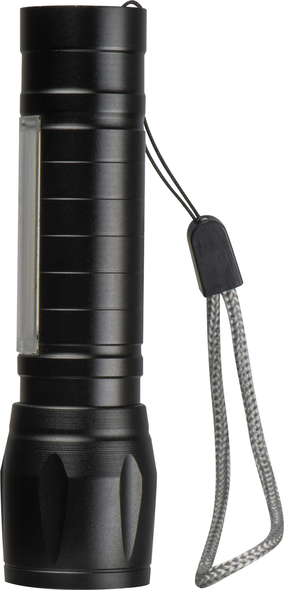 Laetav alumiiniumist taskulamp (400 mAh) mustas karbis, kaasas USB-C laadimiskaabel. Taskulambil on reguleeritava valgusvihuga COB-tuli ja võllil COB-tuli. Teie logo trükitakse kasti kaane keskele.