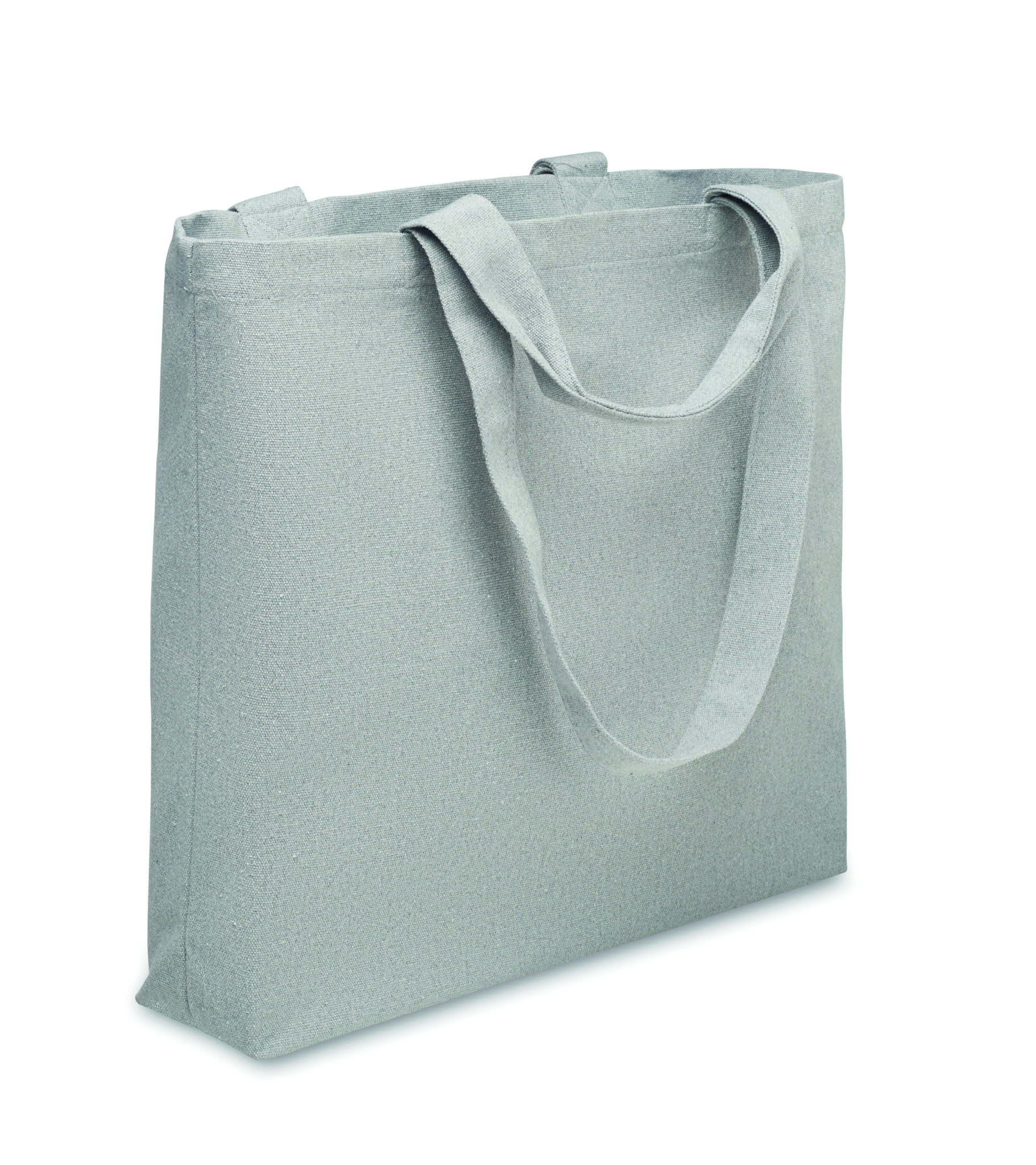 Taaskasutatud kangast (60% taaskasutatud puuvill, 40% taaskasutatud polüester) lühikeste ja pikkade sangadega ostu-/rannakott. 320 gr/m².