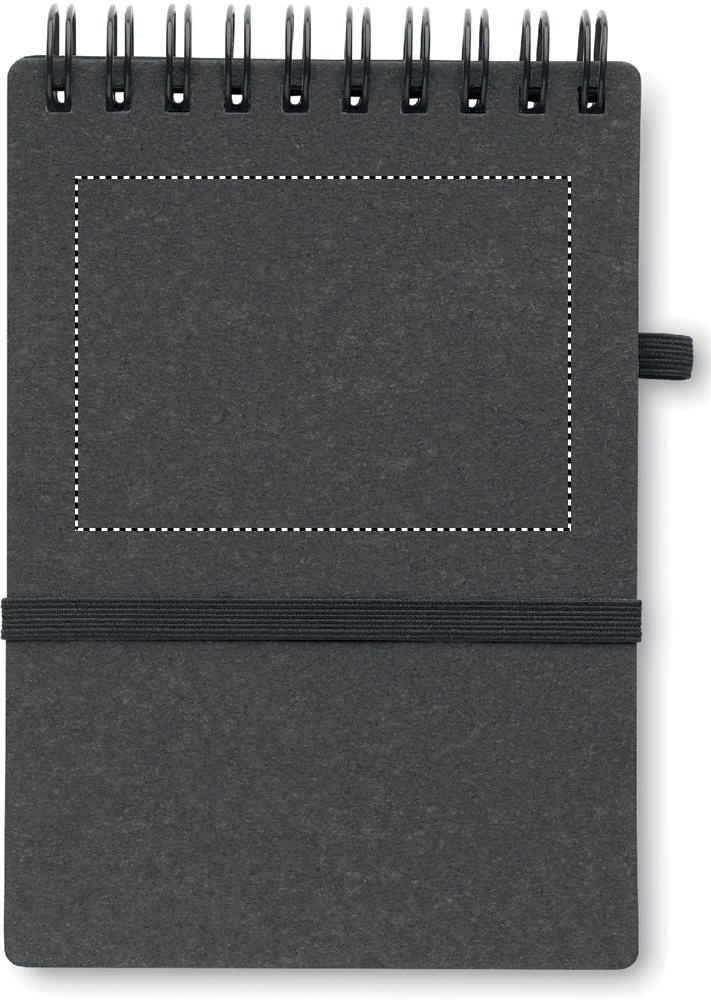 Ümbertöödeldud paberist ja PU (70% taaskasutatud paber ja 30% PU) märkmik. 140 joonega taaskasutatud paberilehte (70 lehte). Nupuga ABS-pastapliiats. Sinine tint. Kummipaela ja pliiatsihoidjaga.