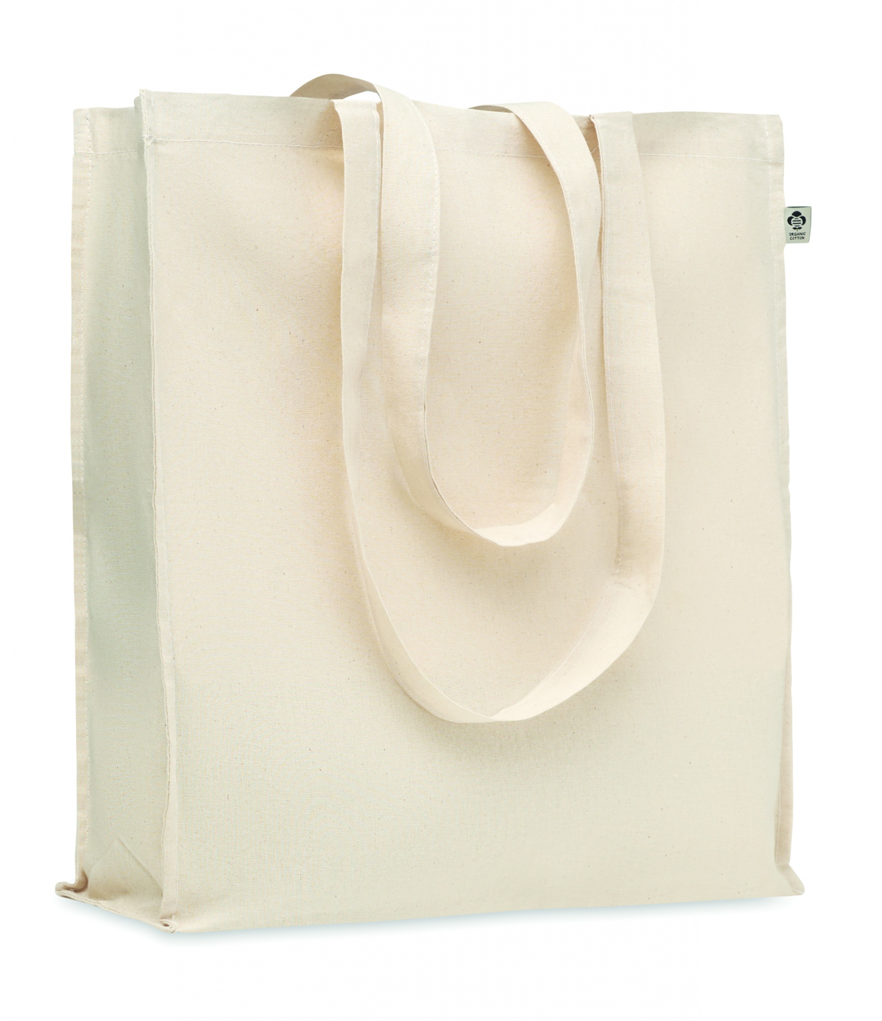 Orgaanilisest puuvillast ostukott pikkade sangade ja kinnitustega. 140 gr/m².