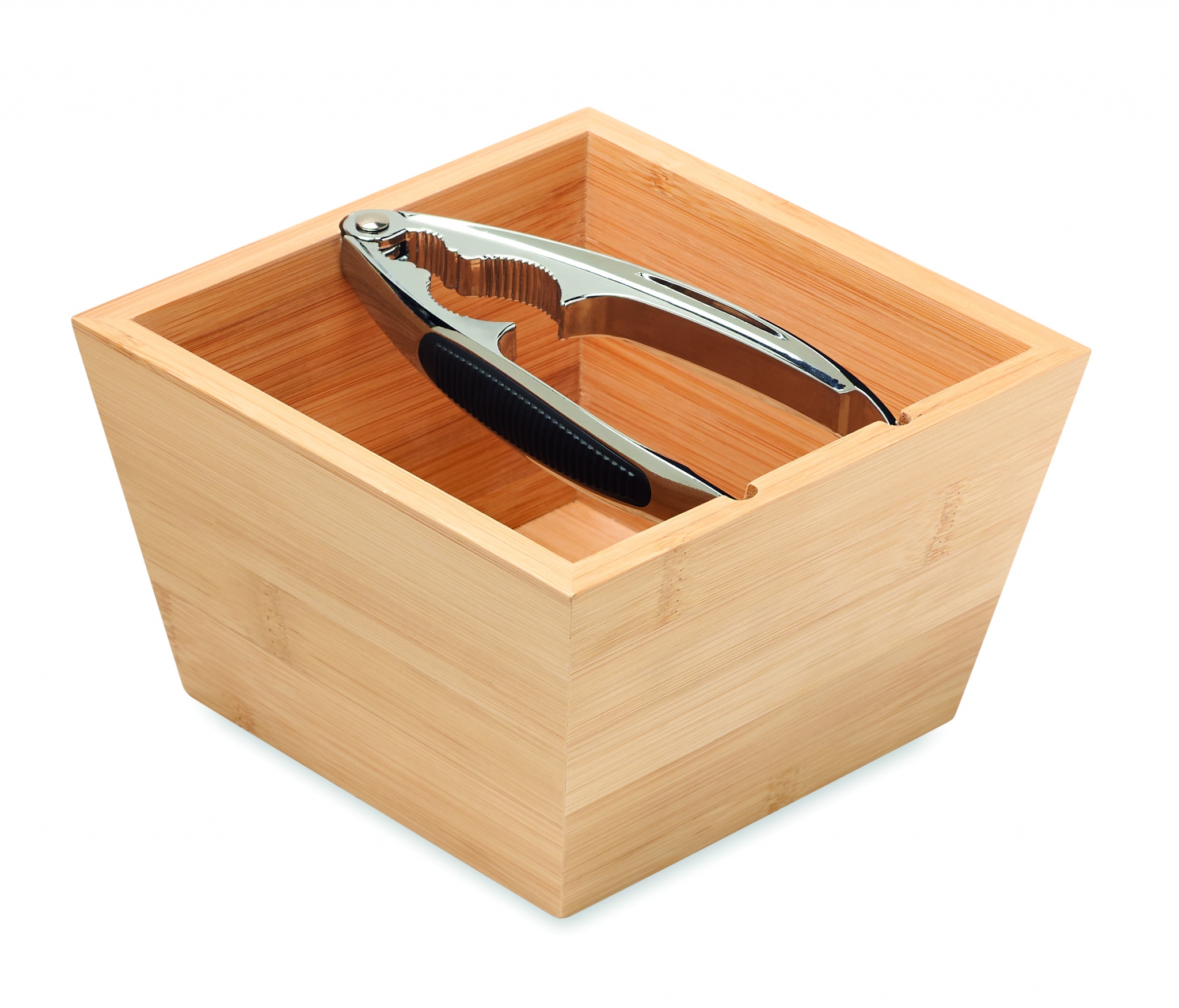 Pähklipurunemise komplekt bambusest kausi ja hõbedase tsingisulamist TPR-käepidemega pähklipurustajaga. Bambus on looduslik toode, ühe eseme värvis ja suuruses võib esineda väikesi erinevusi, mis võivad mõjutada lõppviimistlust.