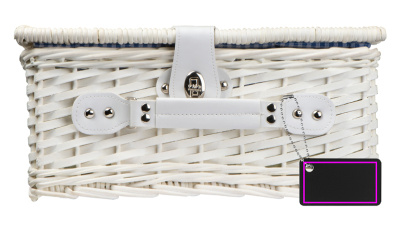 Mini punutud piknikukorv kahele. Keraamiliste taldrikute ja tassidega, roostevabast terasest söögiriistadega, soola- ja pipraga. Teie logo graveeritakse või trükitakse digitaalselt korvi külge kinnitatud alumiiniumsildile.