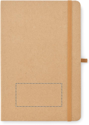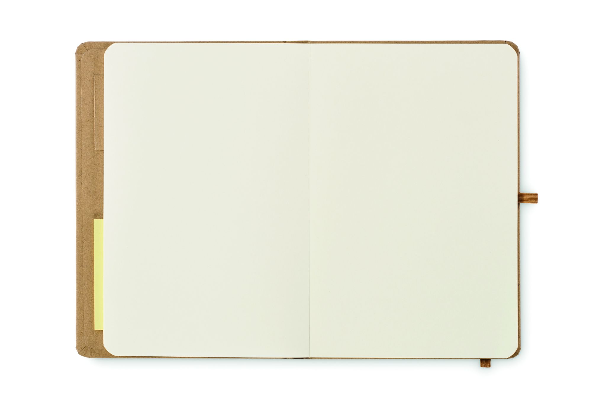 Pappkaanega A5 märkmik, 80 lehte taaskasutatud paberit (160 lehekülge), 25 lehte kleepuvaid märkmeid ja 25 memolehte. Elastne sulgemisrihm ja pliiatsi aas.