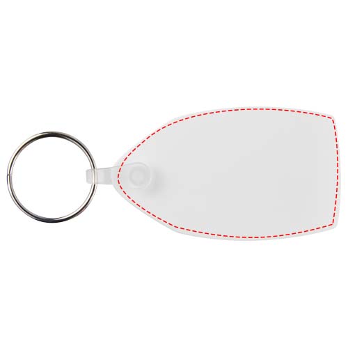 Valge ristkülikukujuline võtmehoidja metallist poolitatud võtmehoidjaga. Metallist silmusrõngas pakub lamedat profiili, mis sobib ideaalselt postitamiseks.
