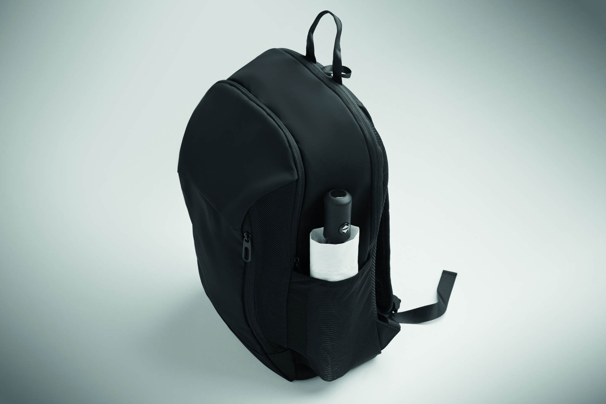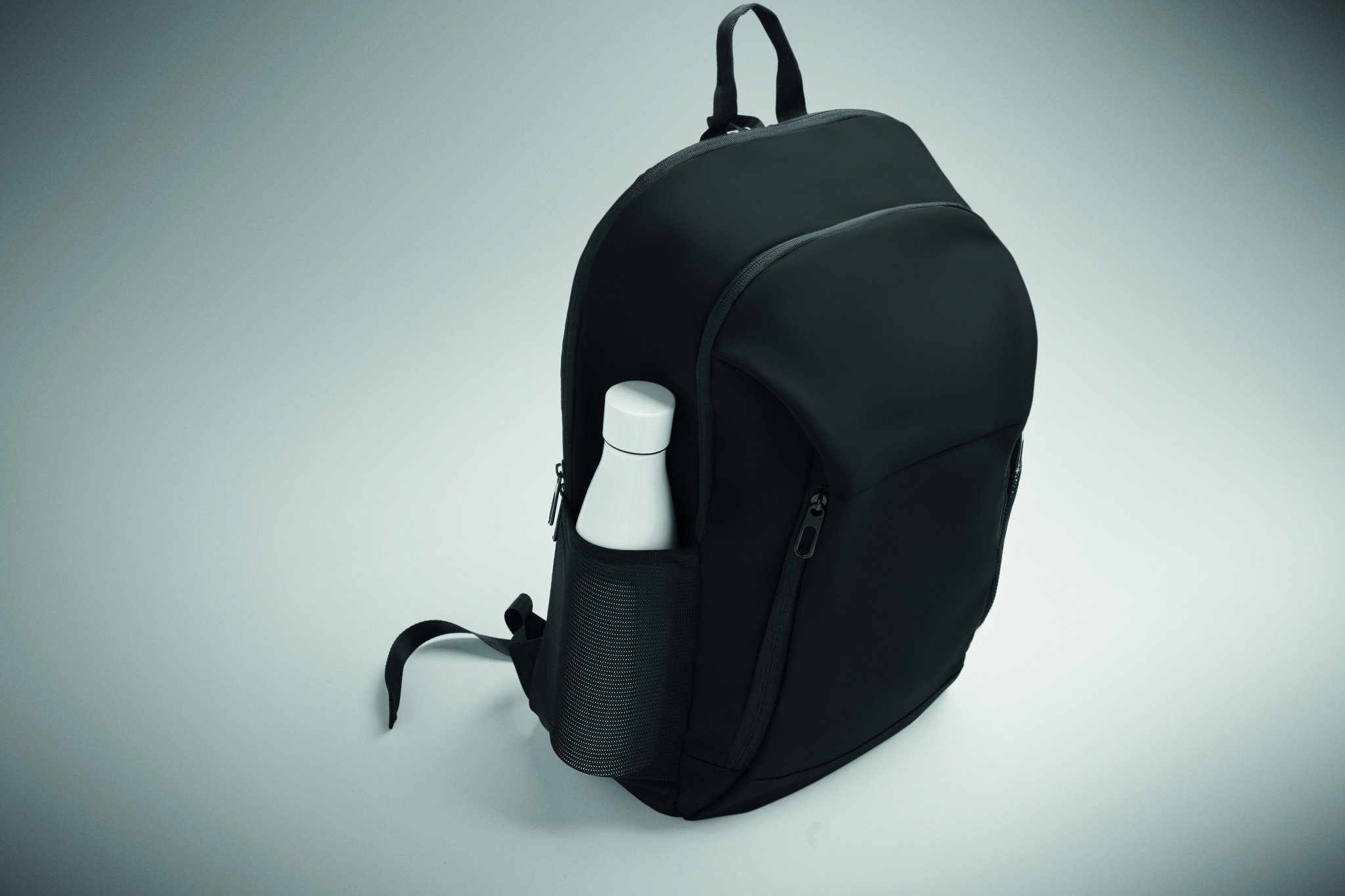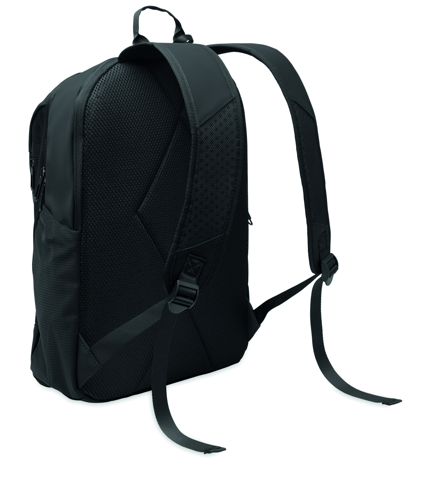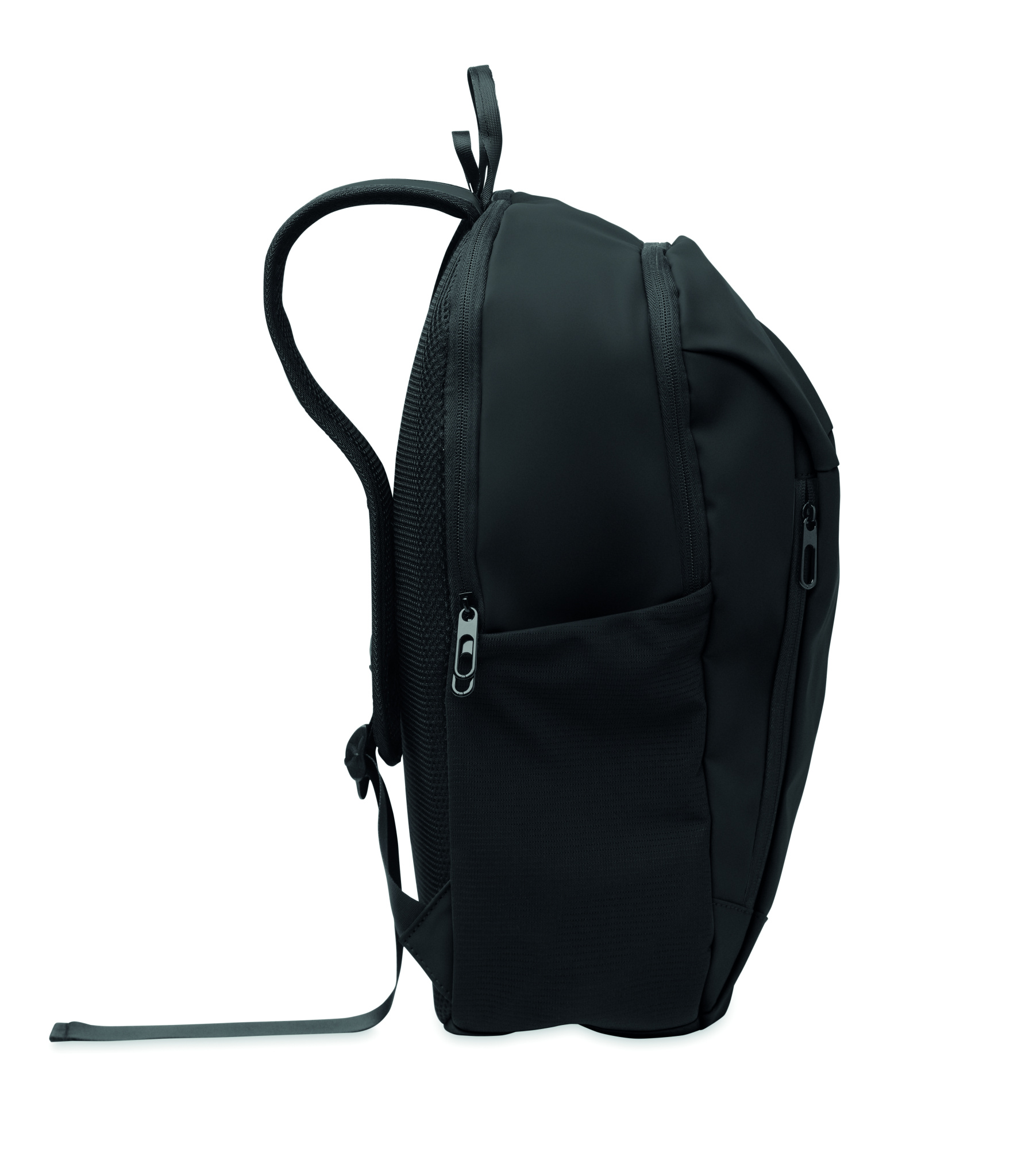 15-tuumainen läppärireppu pehmeästä PU-muovista, jossa pehmustettu selkäosa ja piilotettu vetoketjullinen päälokero. Yksi vetoketjullinen etutasku, kaksi vetoketjullista etutaskua ja kaksi joustavaa verkkotaskua sivuilla. 210D RPET -vuori.