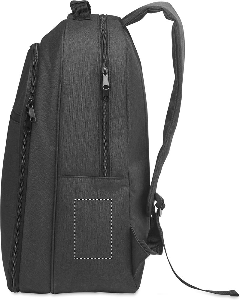 300D RPET-jäähdytysreppu, jossa on 15 tuuman kannettavan tietokoneen lokero. Vetoketjullinen etutasku ja yksi sivussa oleva verkkolokero.