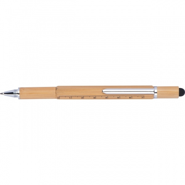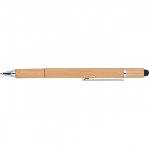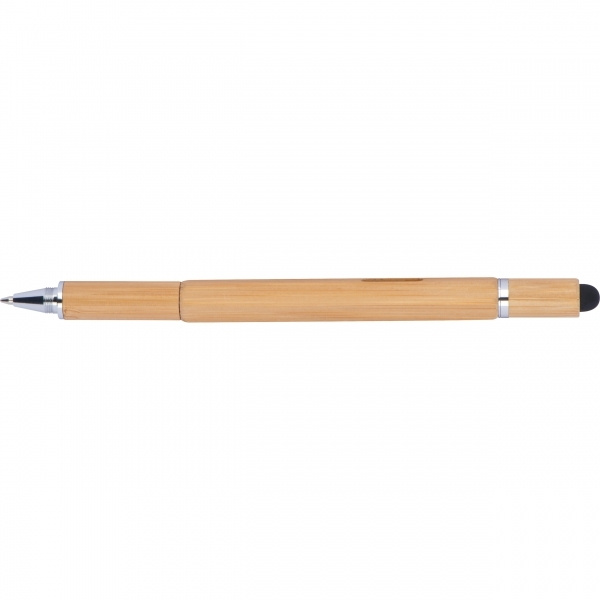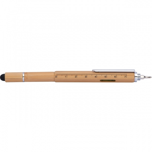 Käytännöllinen 6in1-monitoimi bambukynä seuraavilla ominaisuuksilla: Twist kuulakärkikynällä musta kirjoitusjärjestelmän täyttö, viivain, vesivaaka, ura- ja ristipääruuvimeisseli ja kosketuskynä. Kaiverremme logosi piippuun.
