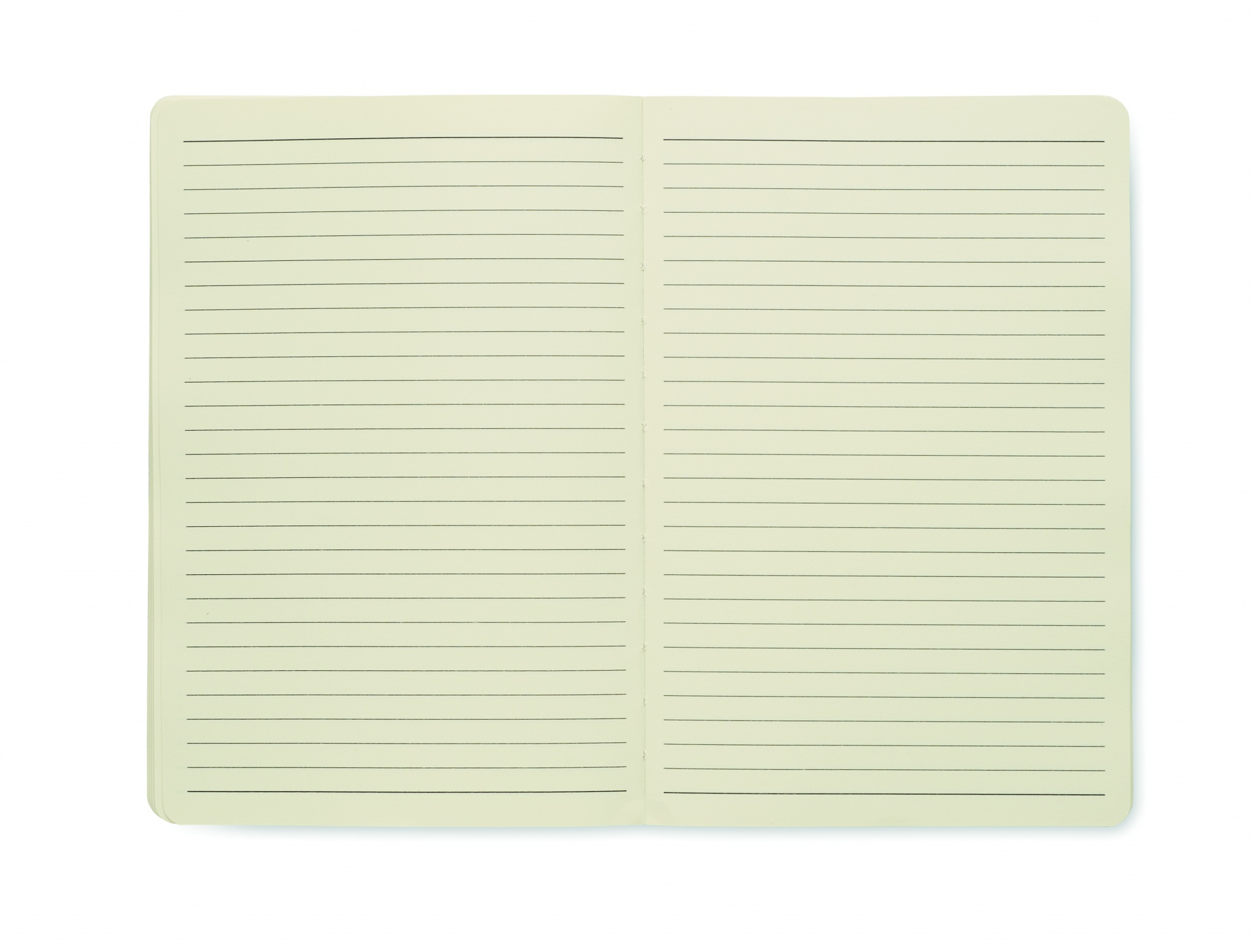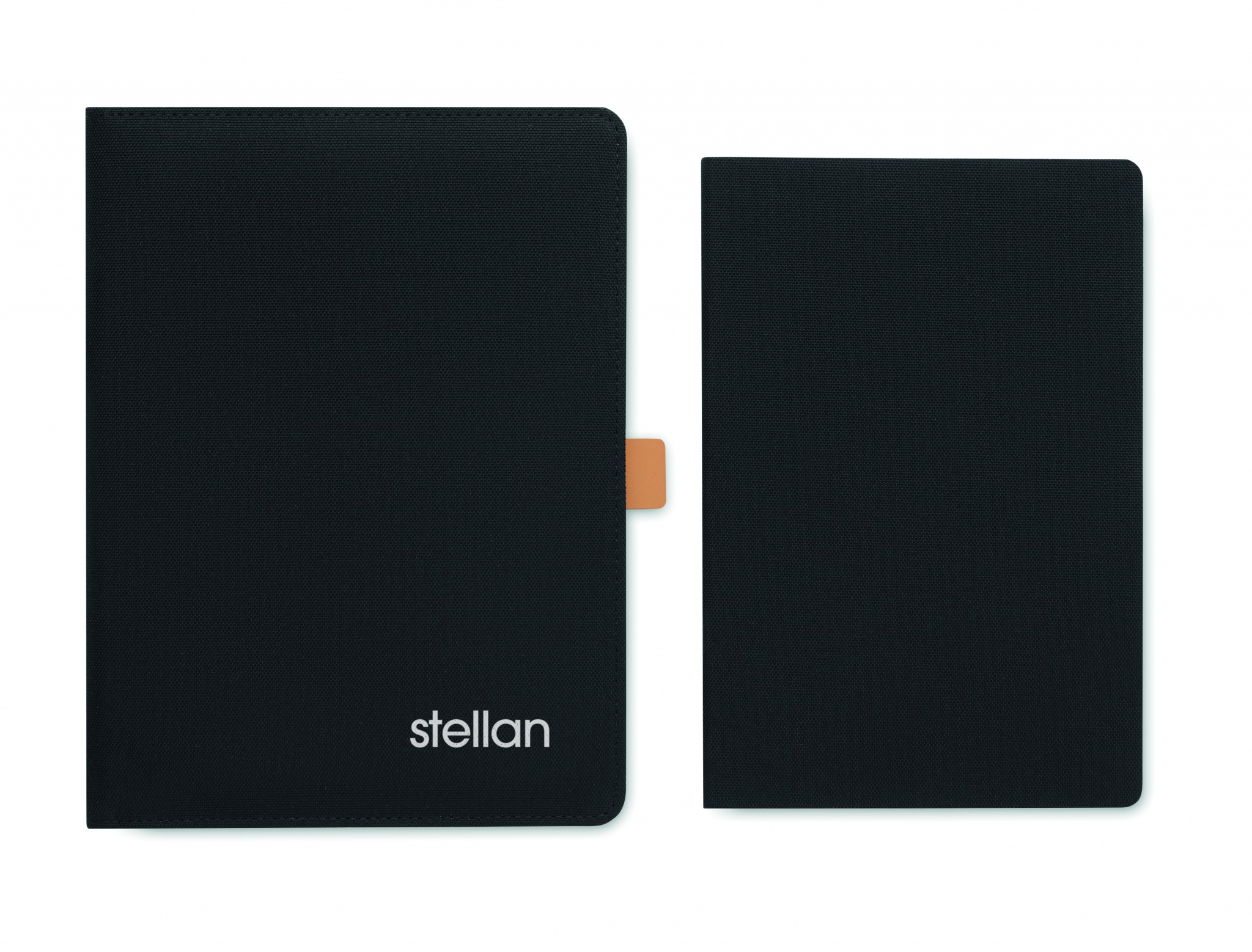 A5-salkku RPET-materiaalista, keinonahkaisilla yksityiskohdilla. A5-muistikirja, jossa on kovakorkkikansi. 128 viivoitettua sivua kierrätyspaperista (64 arkkia). Kynänpidike. 2 korttipidikettä ja yksi iso lokero. Joustava sulkuhihna, jossa metalliset yksityiskohdat.