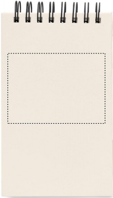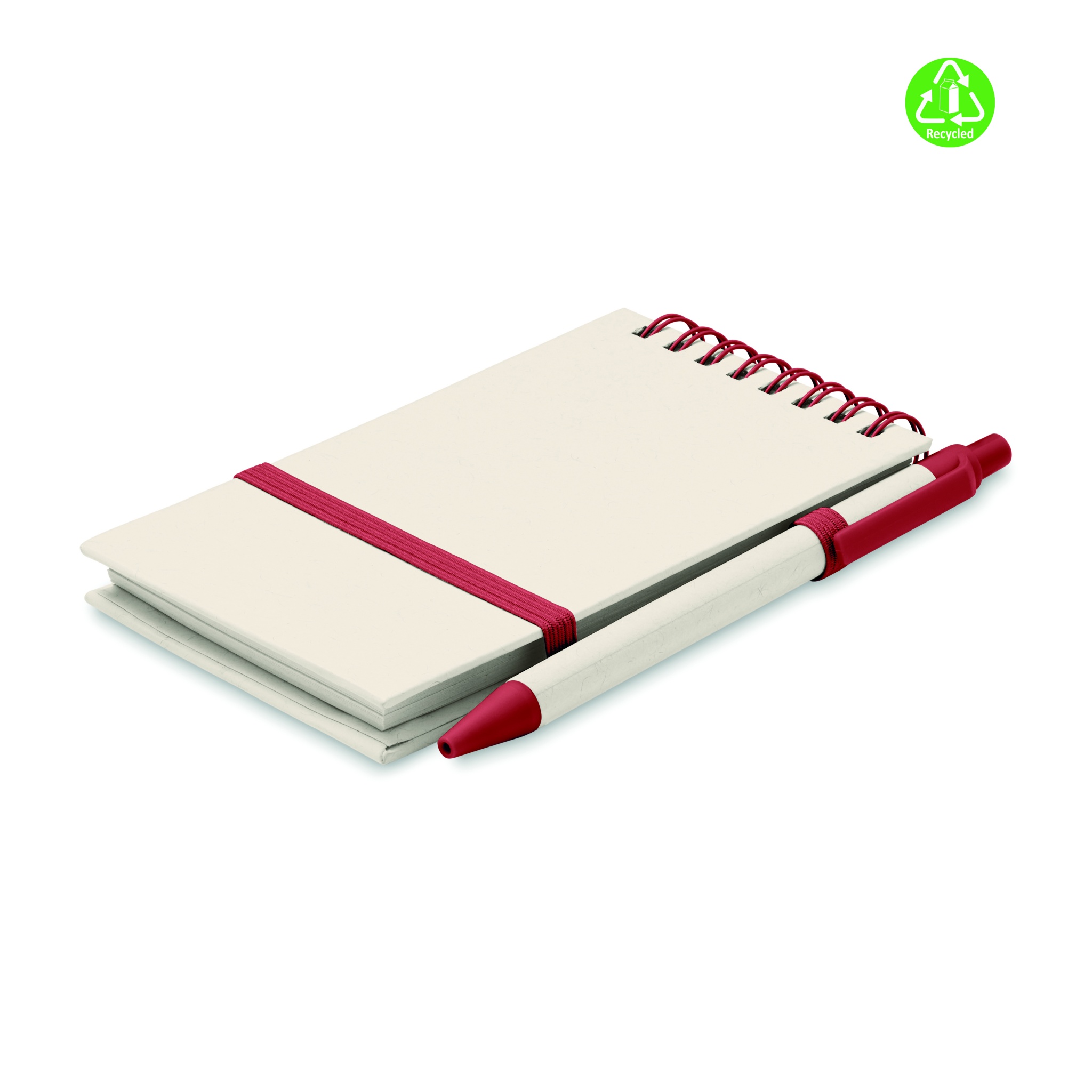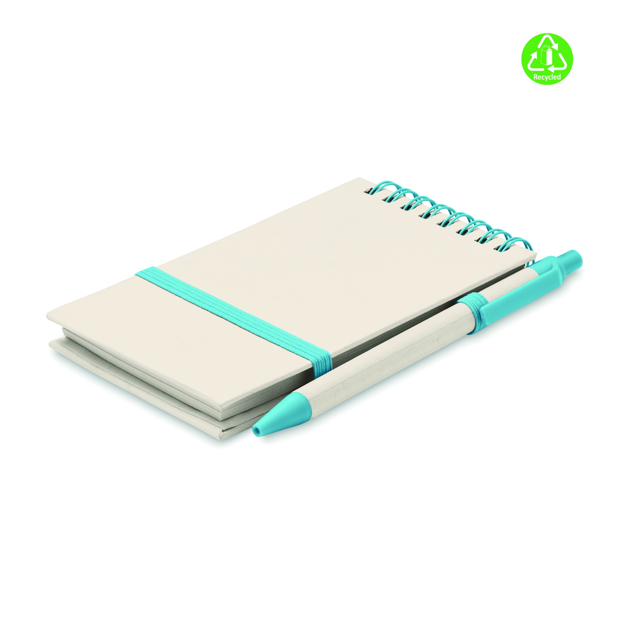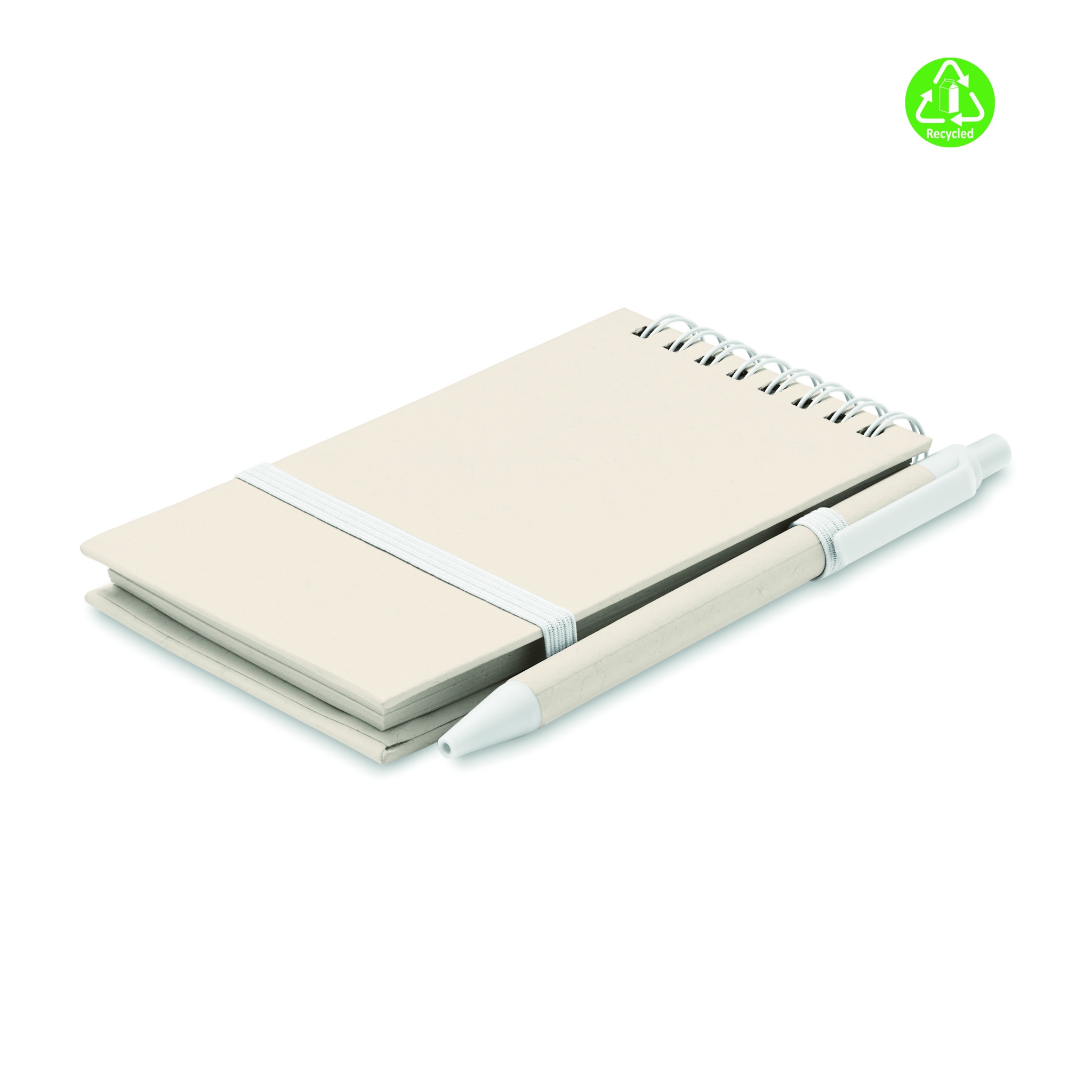 A6 kokoinen muistikirja kierrätyskartongista (70% maitopurkeista tehtyä kartonkia ja 30% kierrätyspaperia) Muistikirjassa on 70 tyhjää sivua, kierresidonta, kiinnitys kuminauhalla ja kynäpidike. Settiin kuuluu samanvärinen kuulakärkikynä sinisellä musteella.