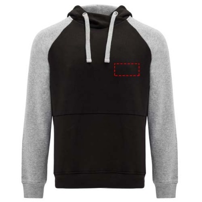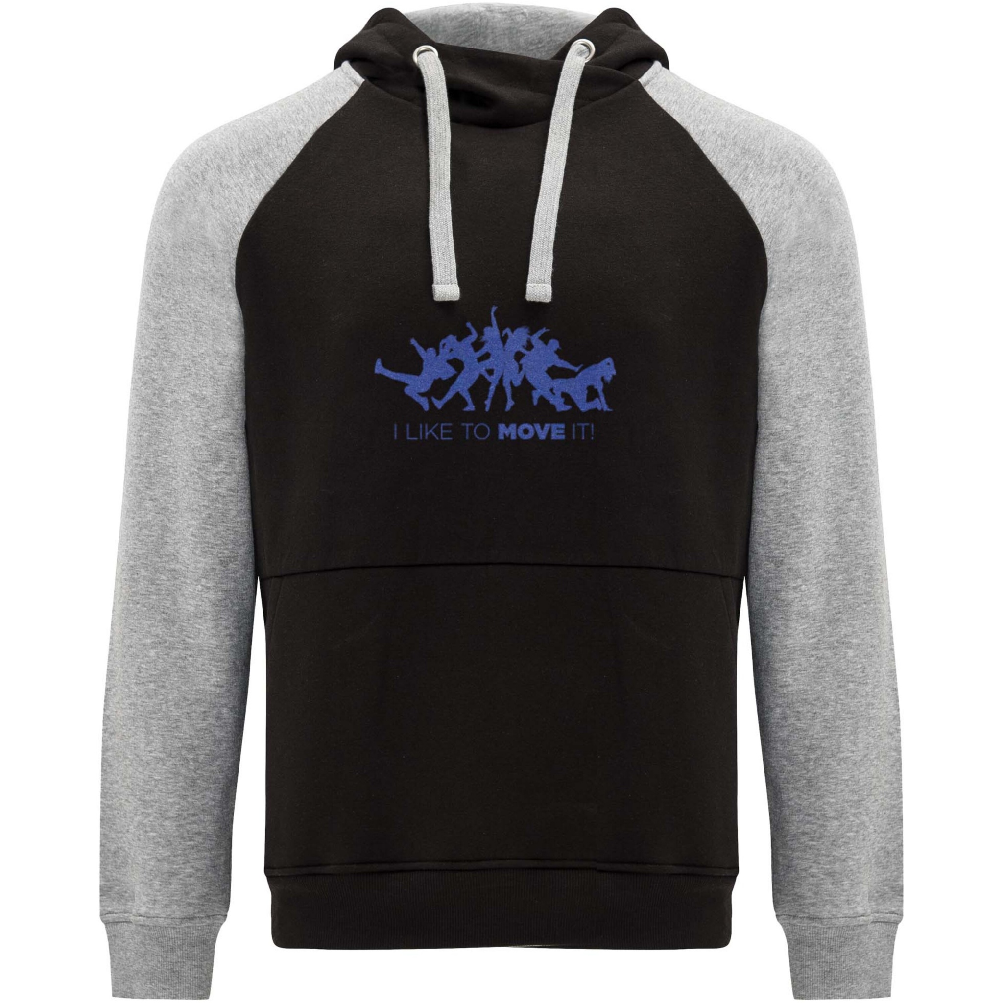 Kaksivärinen unisex-huppari. Hupussa ristikkäinen pääntie ja metallilenkit. Kontrastivärinen hupun sisäosa, kiristysnyöri ja raglan-hihat. Kengurutasku. Hihansuut ja helma 1x1-elastaanijoustinneuletta. Irrotettava etiketti.