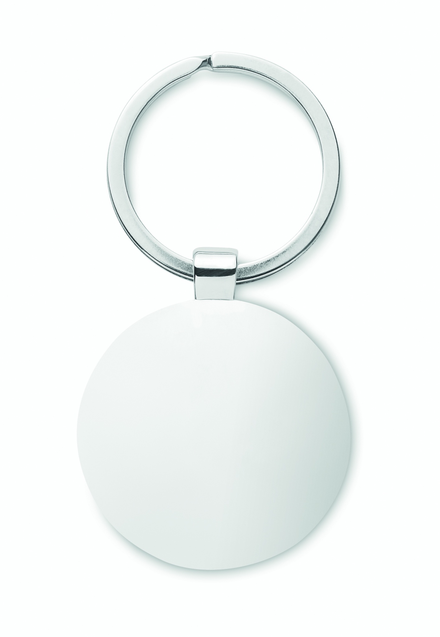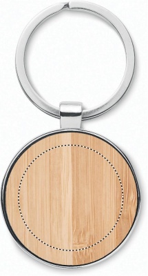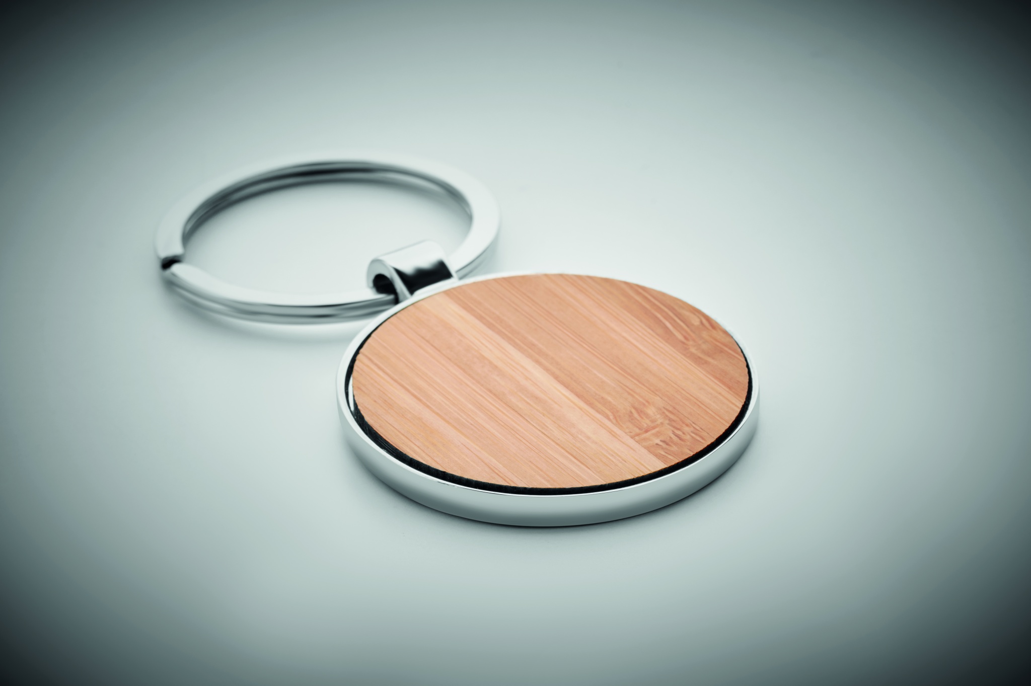 Ympyrän muotoinen sinkkiseoksesta valmistettu avaimenperä bambu yksityiskohdalla. Luonnollisen materiaalin (bambu) vuoksi, tuotteiden värissä/ koossa saattaa olla erinäisyyksiä ja tämä voi vaikuttaa painatuksen lopputulokseen.