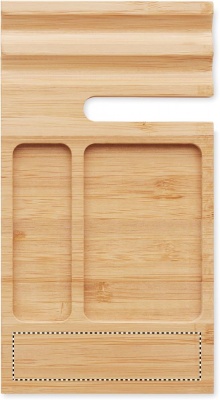 Bambusta valmistettu työpöydän järjestelijä/ puhelinteline. Luonnollisen materiaalin (bambu) vuoksi, tuotteiden värissä/ koossa saattaa olla erinäisyyksiä ja tämä voi vaikuttaa painatuksen lopputulokseen.