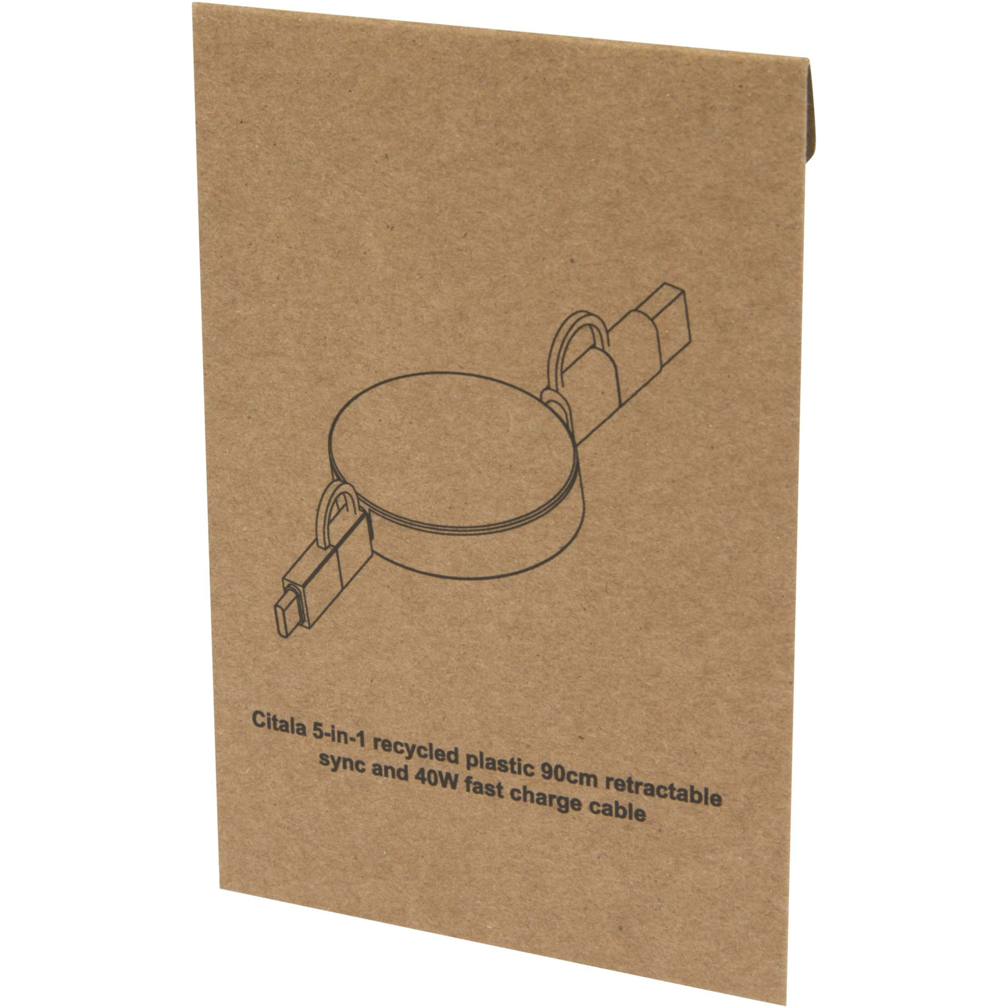 Viisitoiminen sisäänvedettävä Citala datasynkronointi- ja 40 W:n pikalatauskaapeli on valmistettu kierrätysmuovista. Kaapelissa on USB-A- ja C-tyypin tuloliittimet sekä kaksitoiminen C-tyypin ja Lightning-/Micro-USB-yhdistelmälähtöliitin. USB-C to USB-C tarjoaa enintään 40 W:n tehon, USB-A to USB-C enintään 18 W:n ja kaikki muut liitäntävaihtoehdot enintään 15 W:n tehon. Yhteensopiva CarPlayn ja Android Auton kanssa. Oletpa sitten kotona, toimistossa tai liikkeellä, Citala kaapeli tarjoaa suorituskykyä ja tyyliä yhdessä kompaktissa paketissa. Johdon pituus: 90 cm.